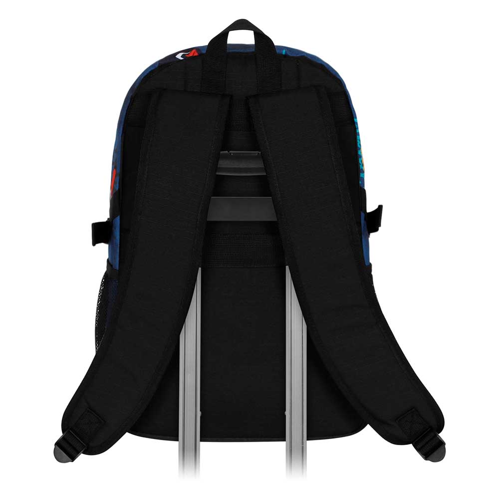 Lightweight urban backpack with a single compartment and two front pockets.body in high strength material (Ripstop), repellent to liquids in moderate quantities. Adjustable padded straps, two side mesh pockets and back strap adaptable to trolley. Interior lining and padded pocket for electronic devices.