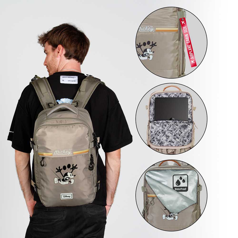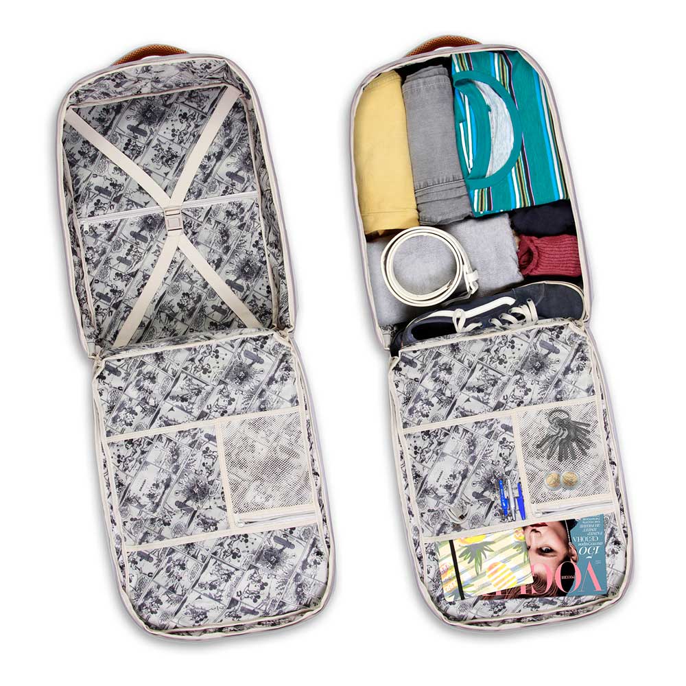 Underseat cabin backpack designed to meet most airlines' carry-on size restrictions. The outer shell crafted from lightweight, waterproof material. Three compartments with a 180-degree opening and printed inner lining. Spacious main compartment withboth zipped and open inner pockets, along with a compression strap to keep your belongings secure. Laptop compartment that accommodates most devices up to 15 inches, with an additional padded pocket for a tablet or smaller accessories.