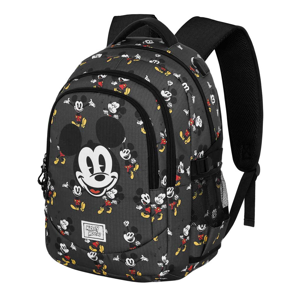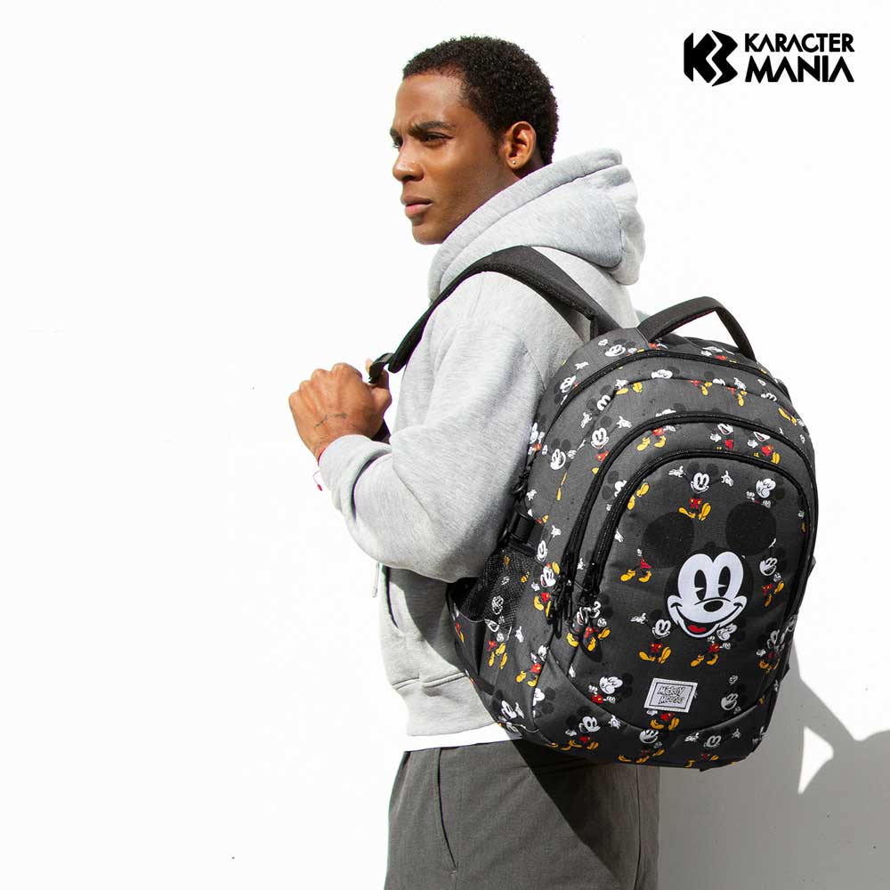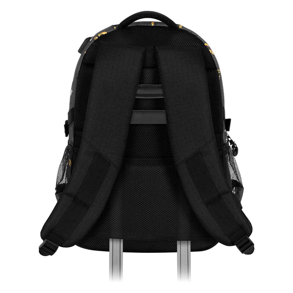 Large capacity backpack with three main compartments and two side mesh pockets. Inner lining with a padded pocket for electronic devices and a small zipped pocket. USB port for charging with powerbank (not included). High resistance material body (Ripstop), repellent to liquids in moderate quantities. Reinforced base and straps, padded top handle and back with ventilation channels. Rear panel for trolley transport.