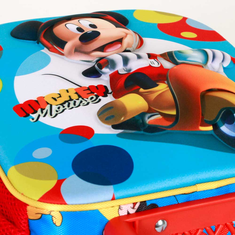 Children's backpack with wheels. Design with embossed front. Main compartment with zipper closure and two mesh side pockets. Non-removable trolley.