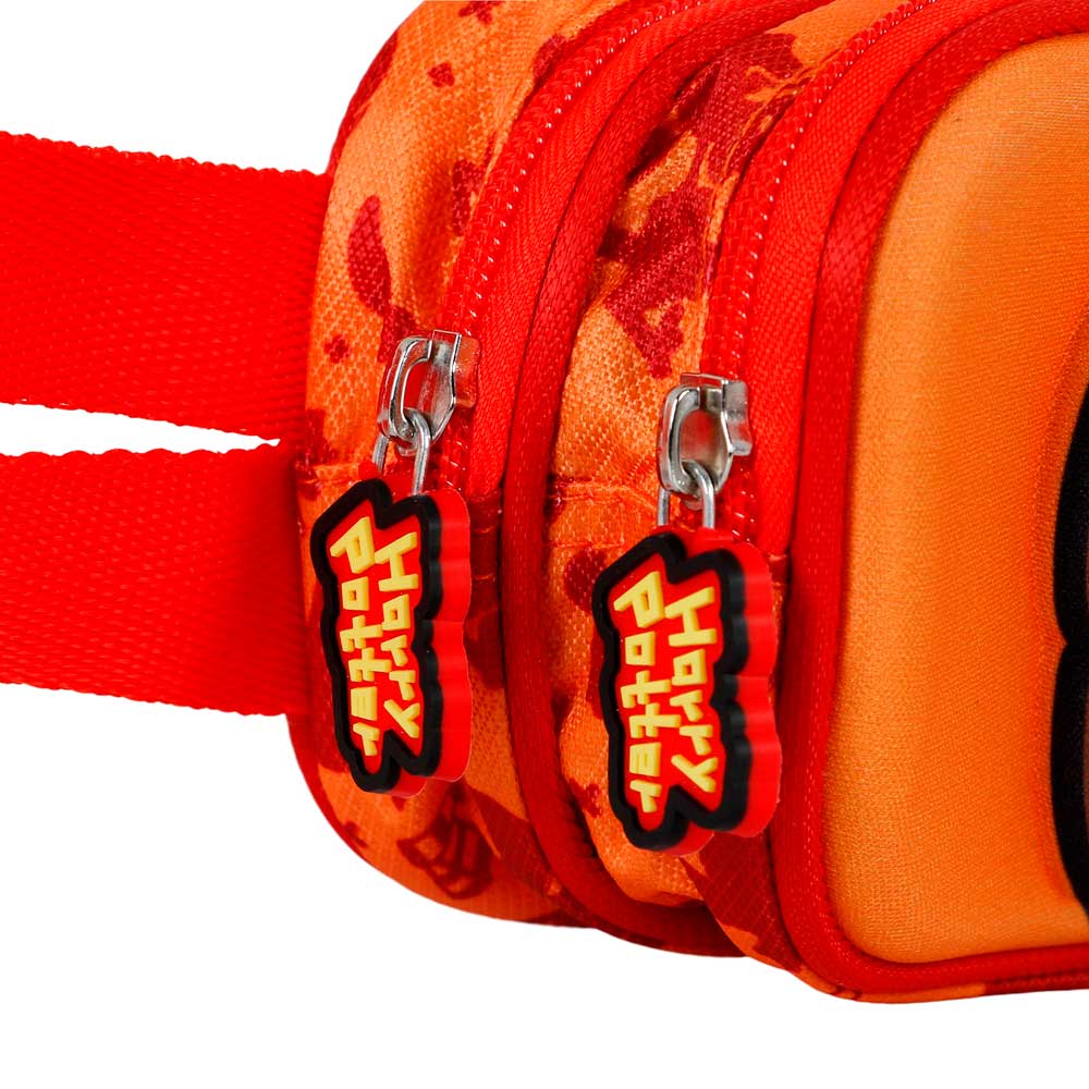 Double compartment pencil case with zipper and inner lining. Front embossed design.