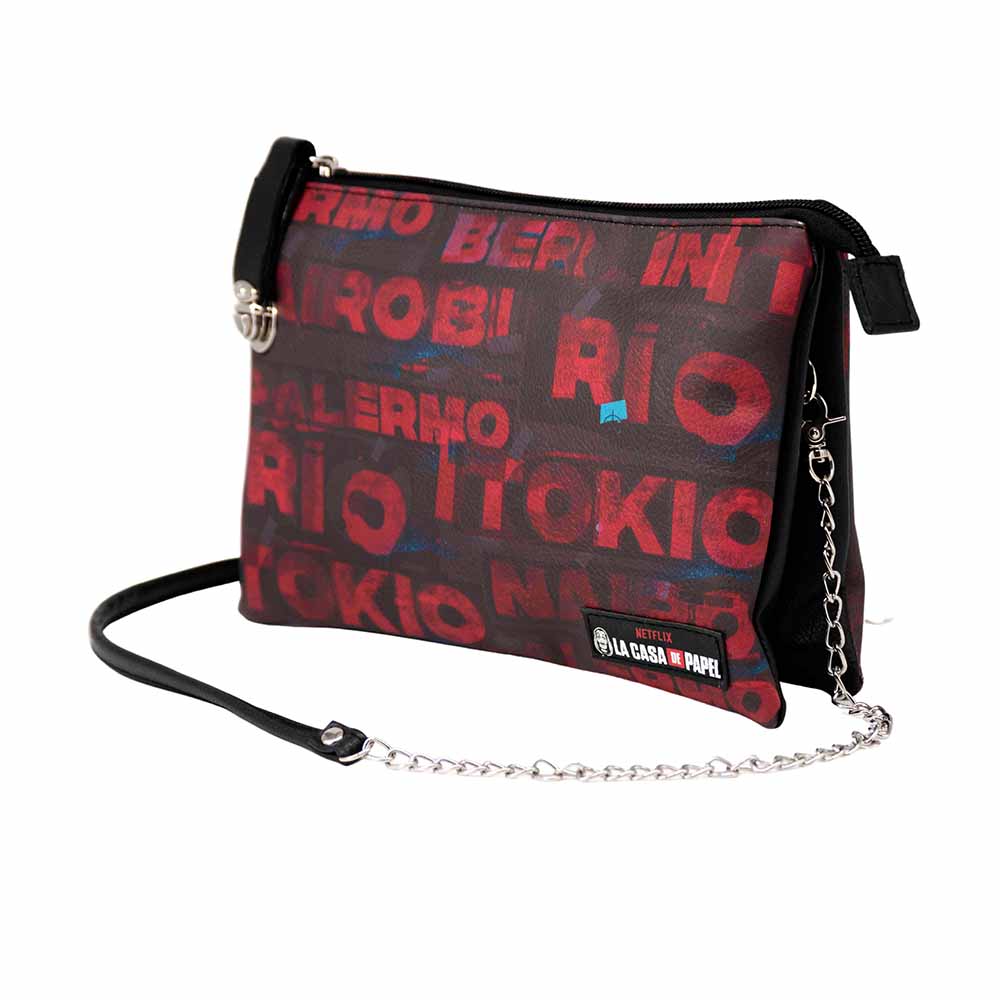 Rectangular shoulder bag with chain to carry over the shoulder. The interior is divided into three separate compartments closed with zipper and buckle for greater security. Includes lining and interior pockets.