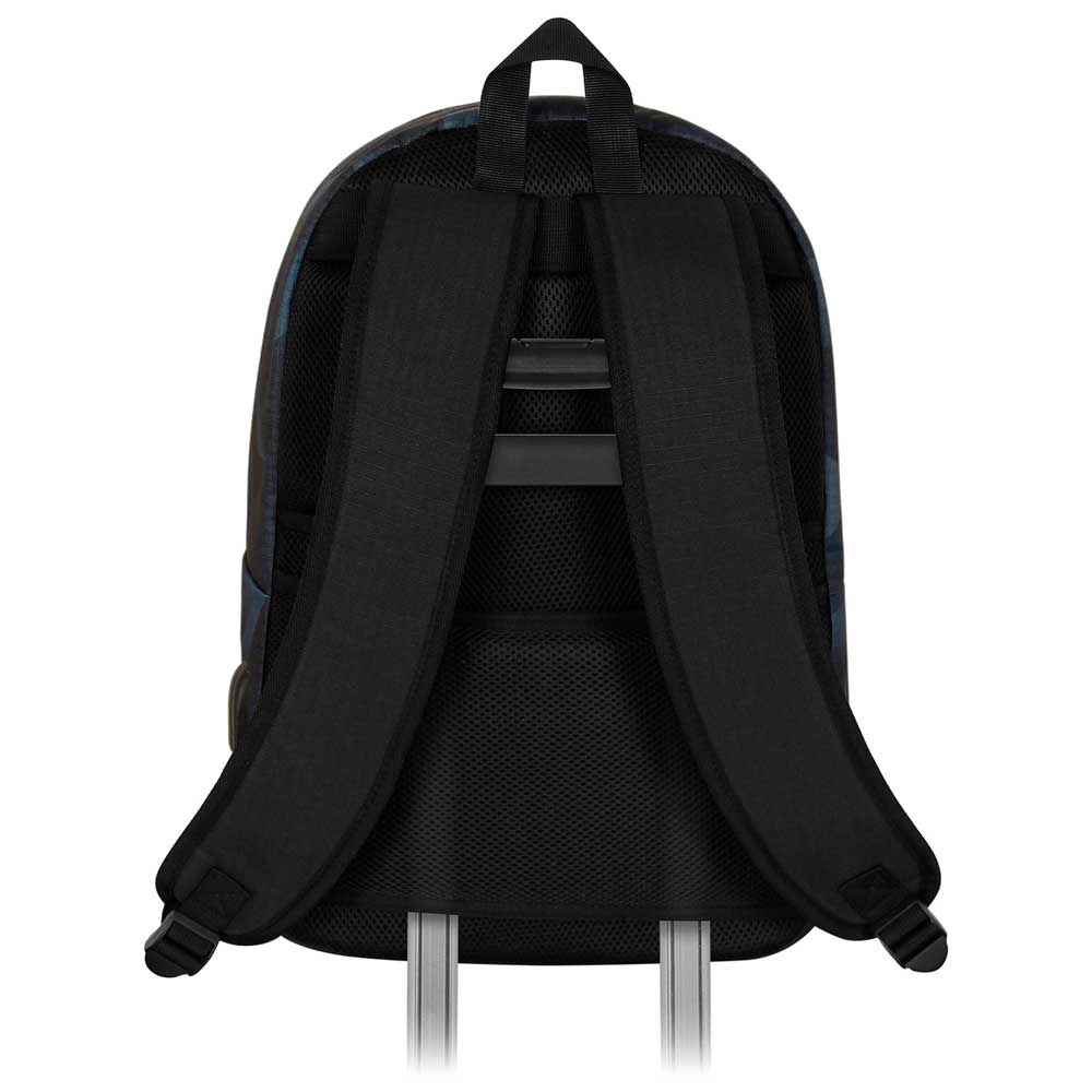 Urban backpack with single compartment and front pocket. Interior lining with a padded pocket for electronic devices and a small zippered pocket. USB port for charging with powerbank (not included) and 3.5mm audio jack. Body in high resistance material (Ripstop) with metallic finish details. Reinforced and adjustable straps. Padded back with ventilation channels and back panel for trolley transport.