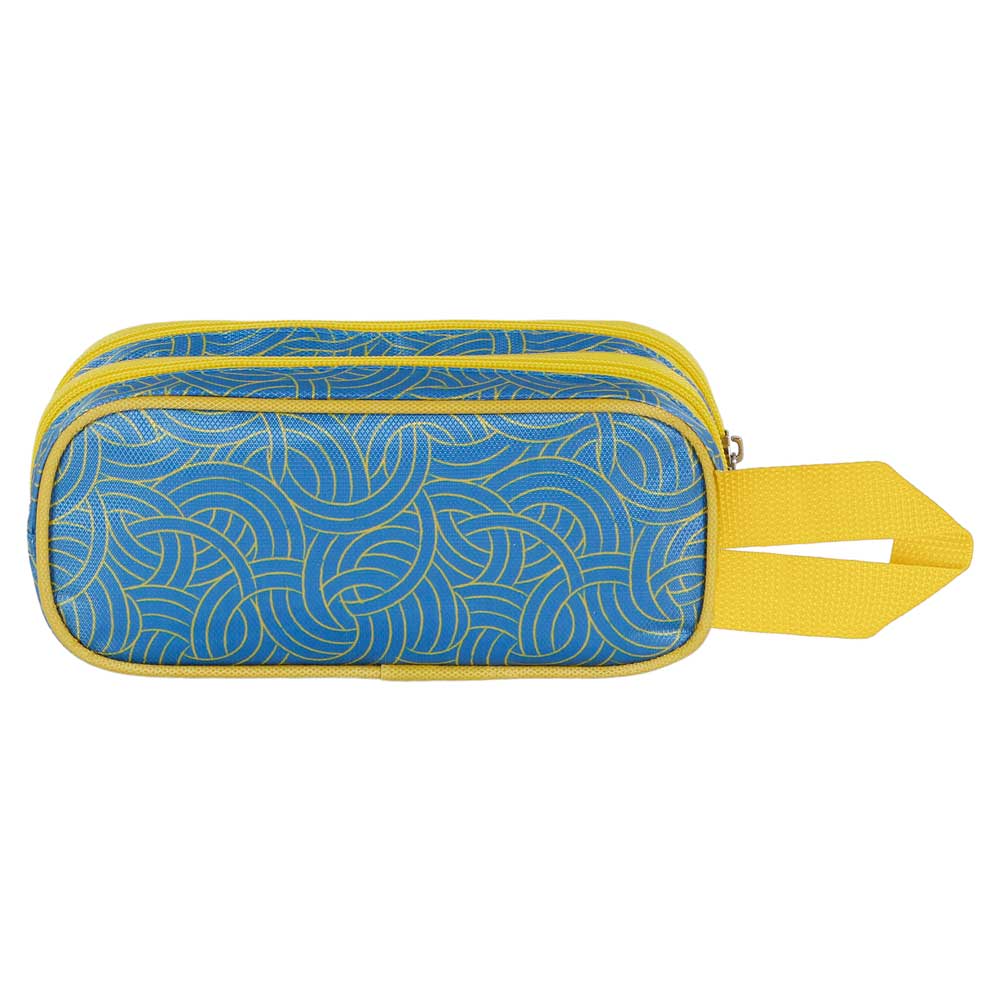 Double compartment pencil case with zipper and inner lining. Front embossed design.