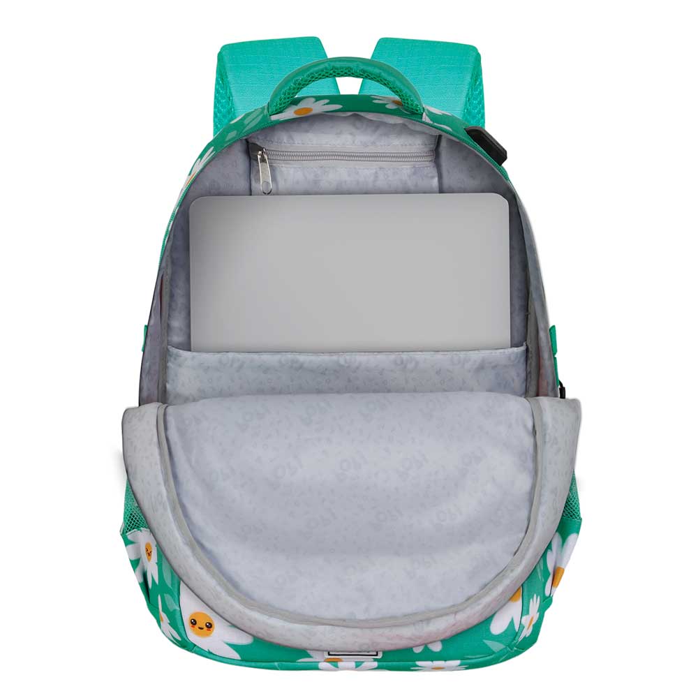 Large capacity backpack with three main compartments and two side mesh pockets. Inner lining with a padded pocket for electronic devices and a small zipped pocket. USB port for charging with powerbank (not included). High resistance material body (Ripstop), repellent to liquids in moderate quantities. Reinforced base and straps, padded top handle and back with ventilation channels. Rear panel for trolley transport.