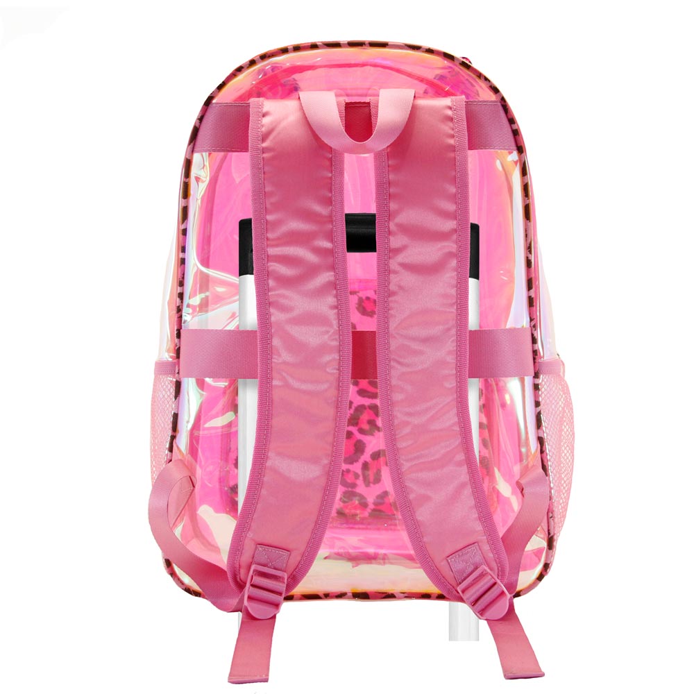 Transparent school backpack with one compartment and one front pocket. Adjustable padded shoulder straps, two side mesh pockets and back trolley strap.