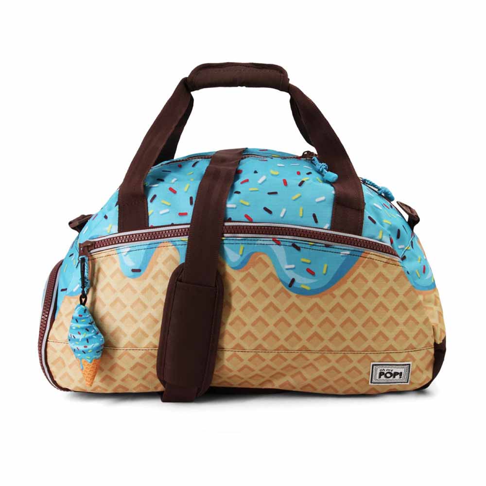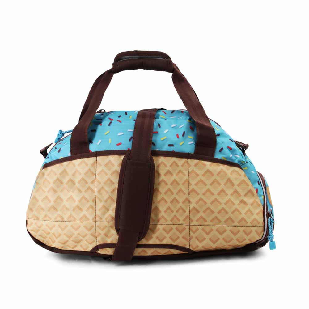 Sports bag with large main compartment and front pocket. Side shoe compartment and inner lining with additional pockets. Equipped with multiple handles for carrying by hand or shoulder.