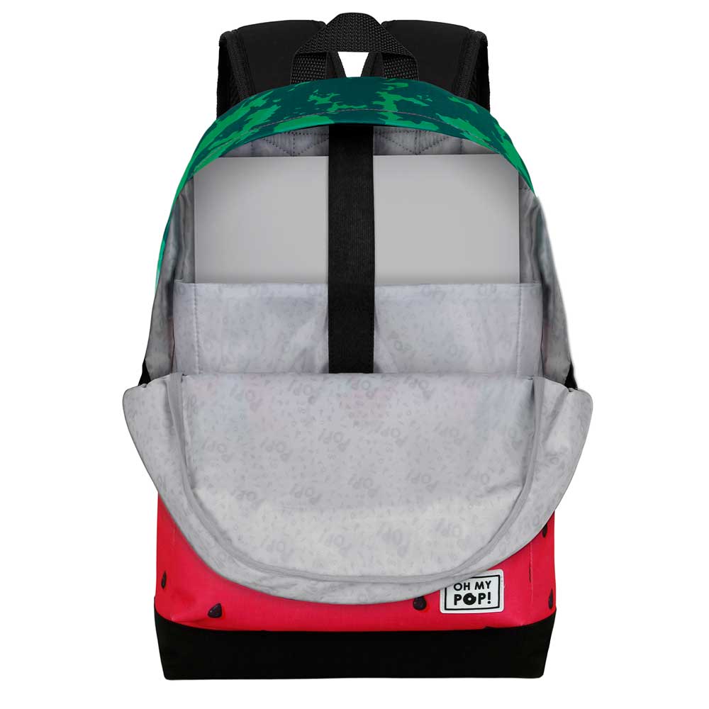 Backpack with a single compartment and a front pocket. Body in high resistance material (Ripstop), repellent to liquids in moderate quantities. Interior lining with pocket for electronic devices. Adjustable padded straps and back strap adaptable to trolley.