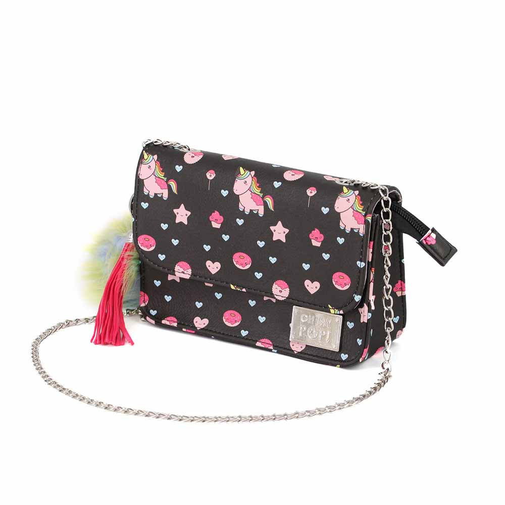 Shoulder bag with flap and magnetic clip. Single zippered compartment with inner lining. Chain shoulder strap of 106cm.
