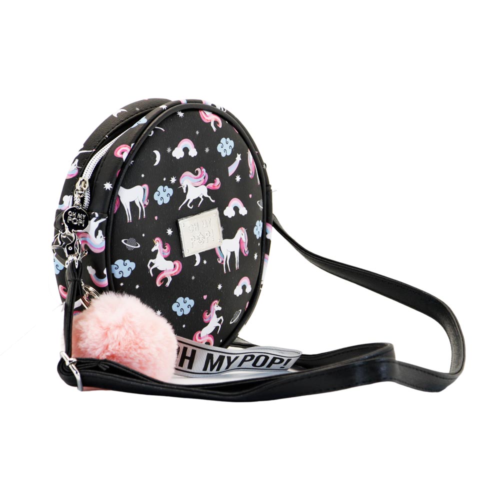 Round shoulder bag. Single compartment with top zipper. Adjustable shoulder strap between 50cm and 100 cm.