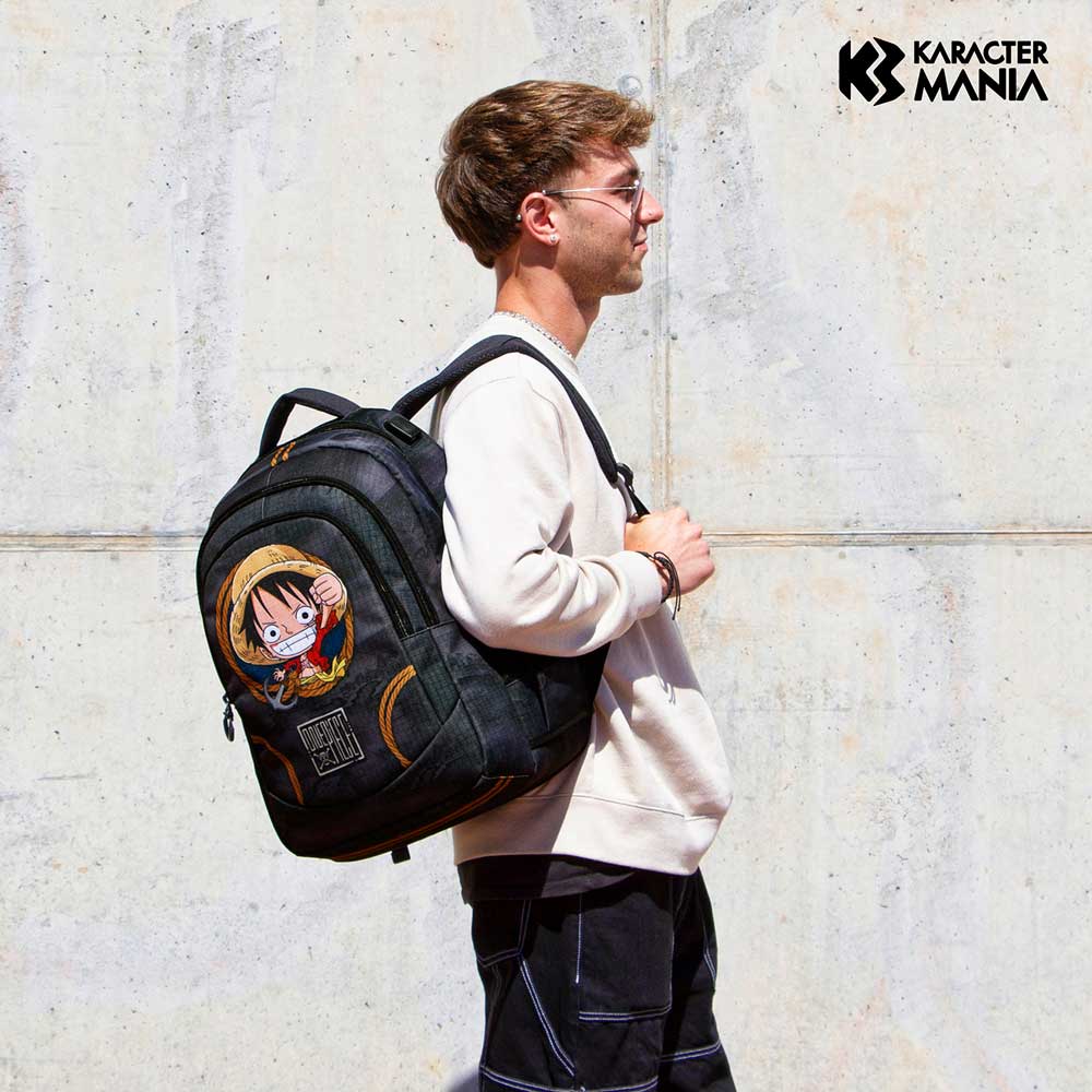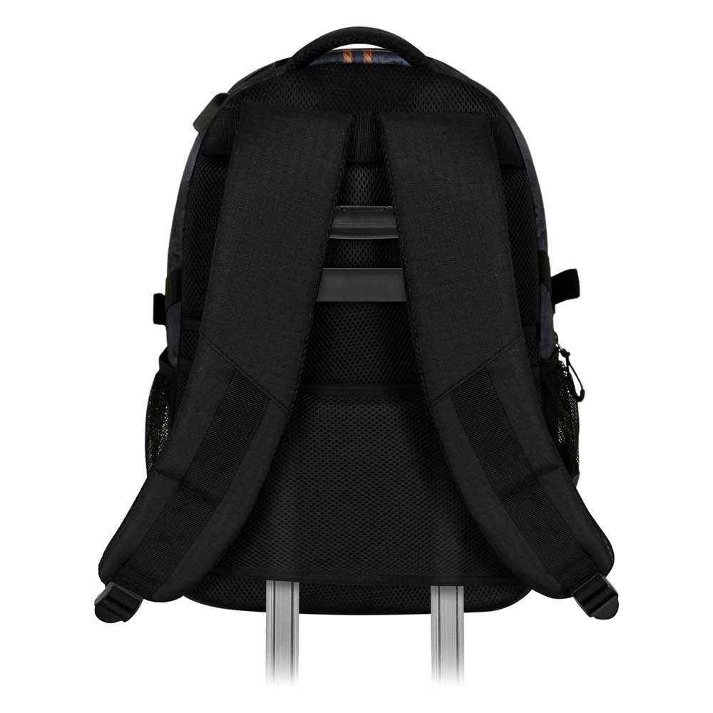 Large capacity backpack with three main compartments and two side mesh pockets. Inner lining with a padded pocket for electronic devices and a small zipped pocket. USB port for charging with powerbank (not included). High resistance material body (Ripstop), repellent to liquids in moderate quantities. Reinforced base and straps, padded top handle and back with ventilation channels. Rear panel for trolley transport.