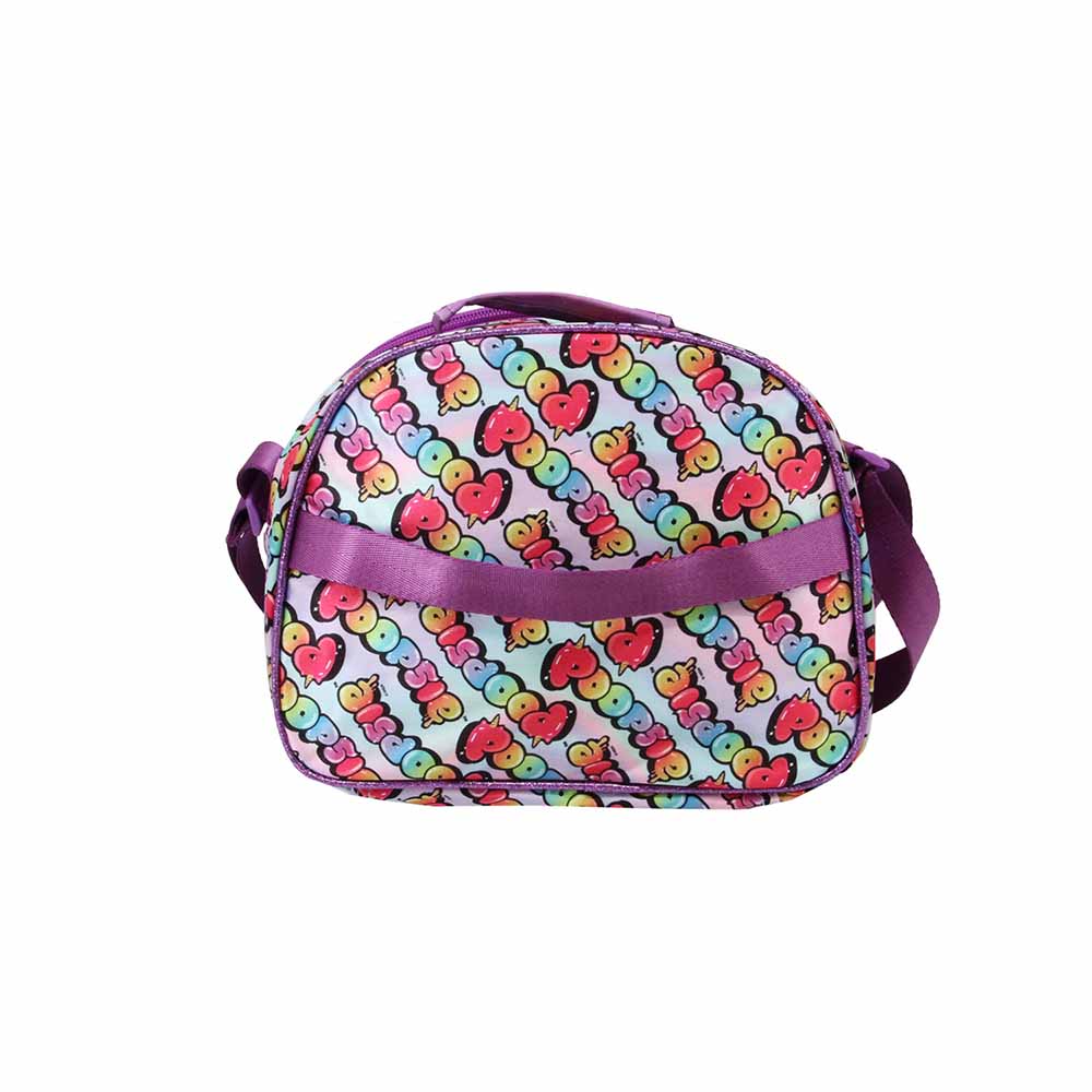Single compartment lunch bag with isothermal lining to preserve food at optimal temperature. Zippered closure, top handle and adjustable 55-110cm long shoulder strap. Design with embossed front. Rear strap for transport on trolley.