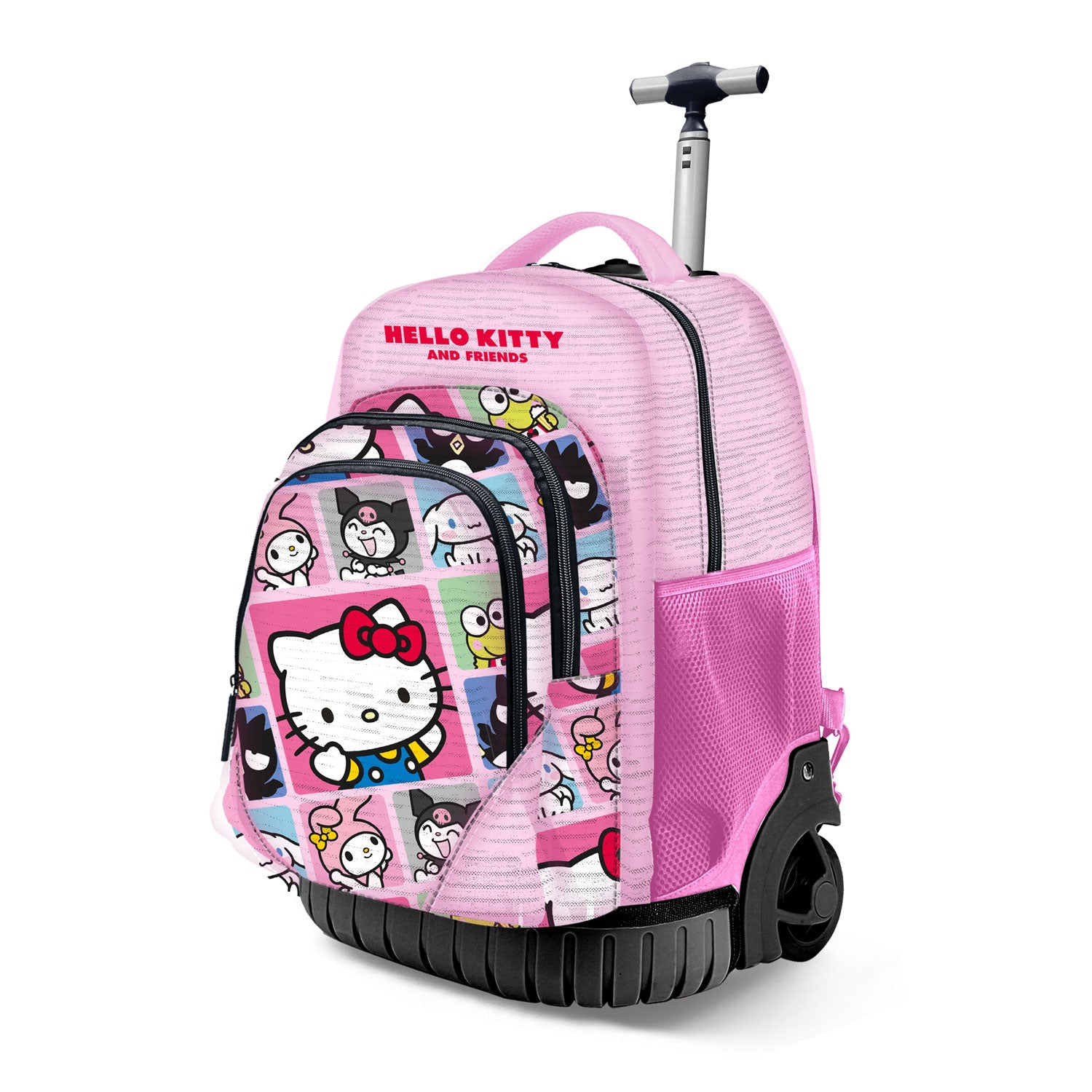 School backpack with 2 integrated wheels. Two compartments, a front pocket and two side mesh pockets. Lined interior with padded pocket for electronic devices. Shoulder straps to carry as a backpack.