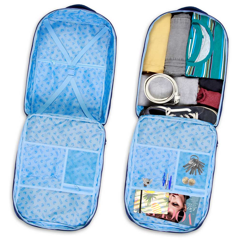 Large capacity travel backpack, compatible as overhead compartment luggage, offering an alternative to the cabin suitcase. Outer structure in lightweight and waterproof material. Three compartments with 180° opening and printed inner lining. Spacious main compartment with zippered, open interior pockets, along with a tether strap. Laptop compartment for devices up to 17", with padded pocket for a tablet or other accessories. Waterproof front compartment to separate wet items from the rest of your belongings. Exterior side pocket to store a water bottle and front pocket. Back strap to fix the backpack on top of the suitcase. Includes padded top handle, reinforced shoulder straps with straps, chest strap and 4 side straps to adapt the volume of the backpack. Back with padded back pads to allow air circulation and a back safety pocket.