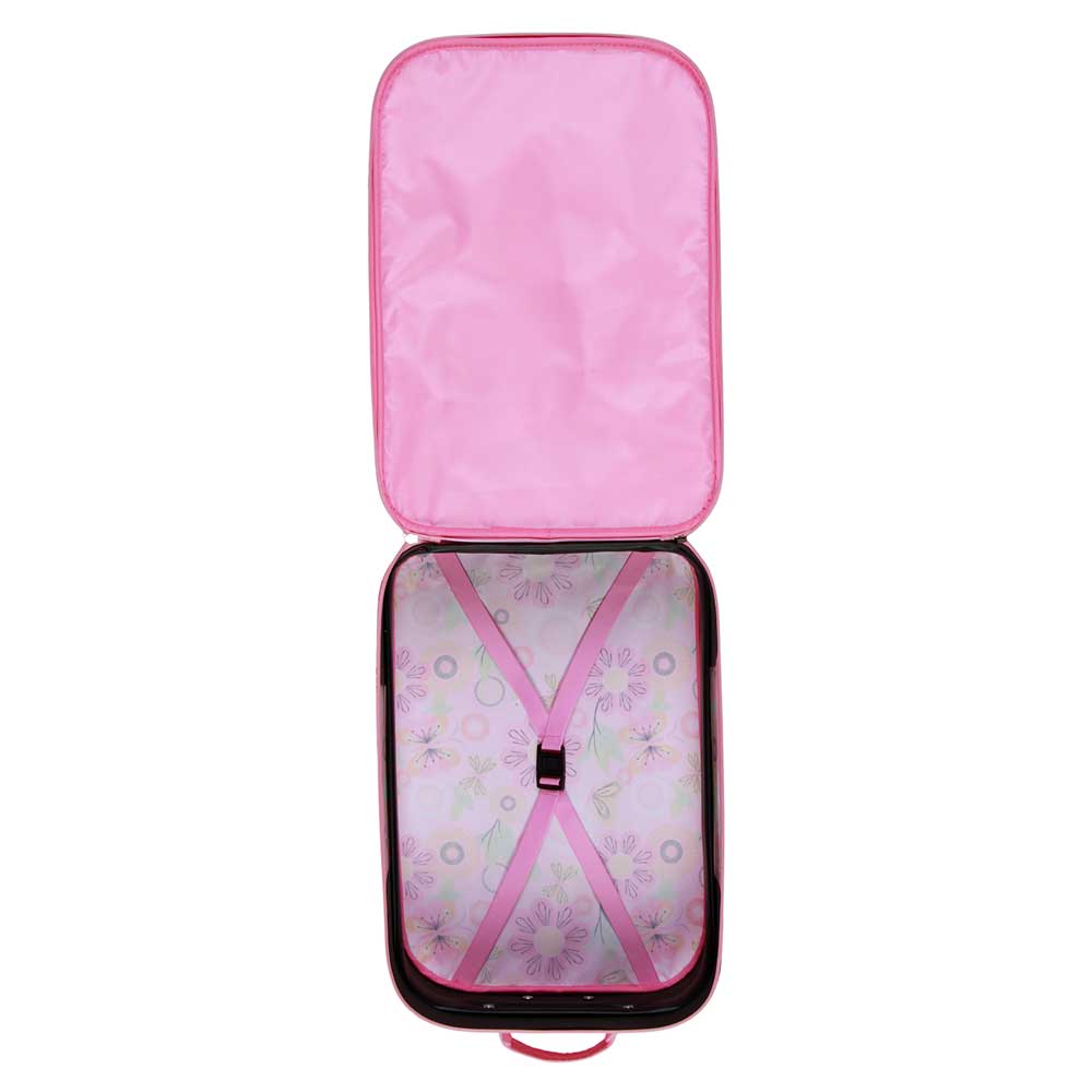 Bagage à main pour les enfants avec deux roues pour un mouvement facile. Fermé par une fermeture éclair et des bandes élastiques intérieures pour maintenir les vêtements.