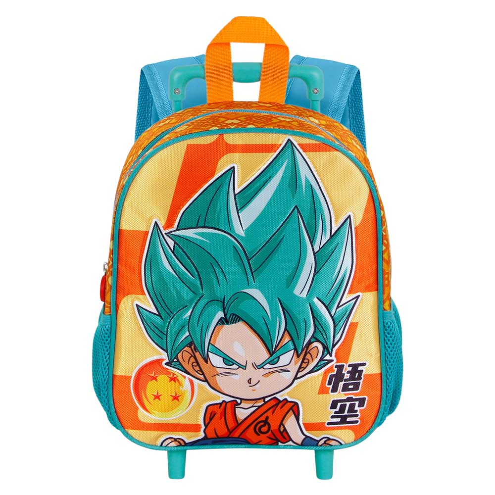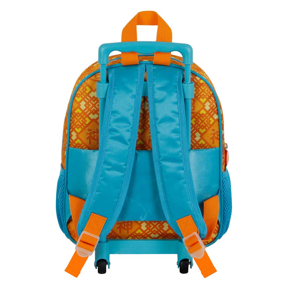 Sac à dos pour enfants avec roues. Compartiment principal avec fermeture à glissière et deux poches latérales en maille. Chariot non amovible.