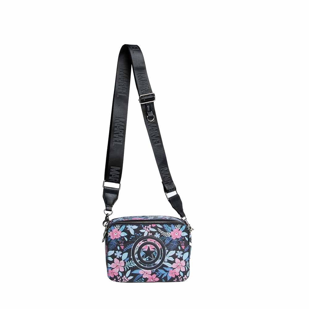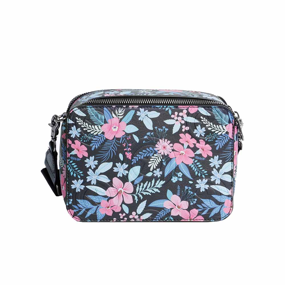 Sac à bandoulière à un seul compartiment. Extérieur orné et fermeture à deux zips. Poignée réglable de 160 cm.