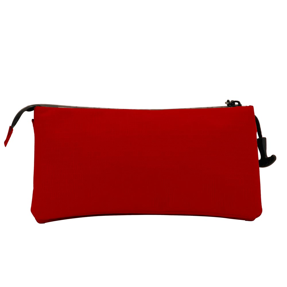 Trousse rectangulaire à trois compartiments avec corps hydrofuge. Les deux poches extérieures s'ouvrent avec la fermeture éclair principale et la troisième avec la sienne.