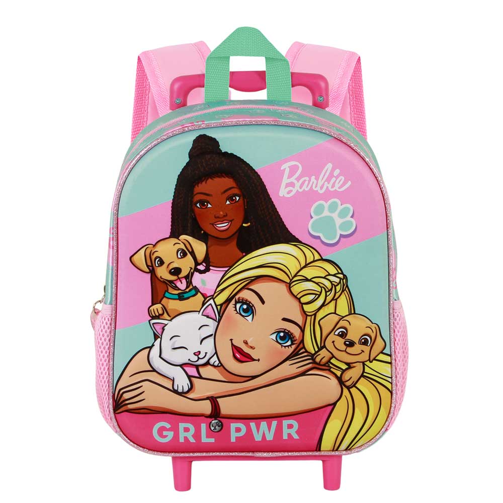 Zainetto per bambini con ruote. Design con frontale in rilievo. Scomparto principale con chiusura a cerniera e due tasche laterali in rete. Carrello non rimovibile.