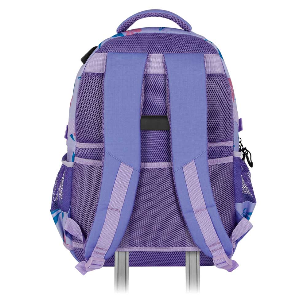 Zaino di grande capacità con tre scomparti principali e due tasche laterali in rete. Fodera interna con una tasca imbottita per i dispositivi elettronici e una piccola tasca con cerniera. Porta USB per la ricarica della powerbank (non inclusa). Corpoin materiale ad alta resistenza (Ripstop), repellente ai liquidi in quantità moderate. Base e cinghie rinforzate, maniglia superiore e schienale imbottiti con canali di ventilazione. Pannello posteriore per il trasporto con trolley.