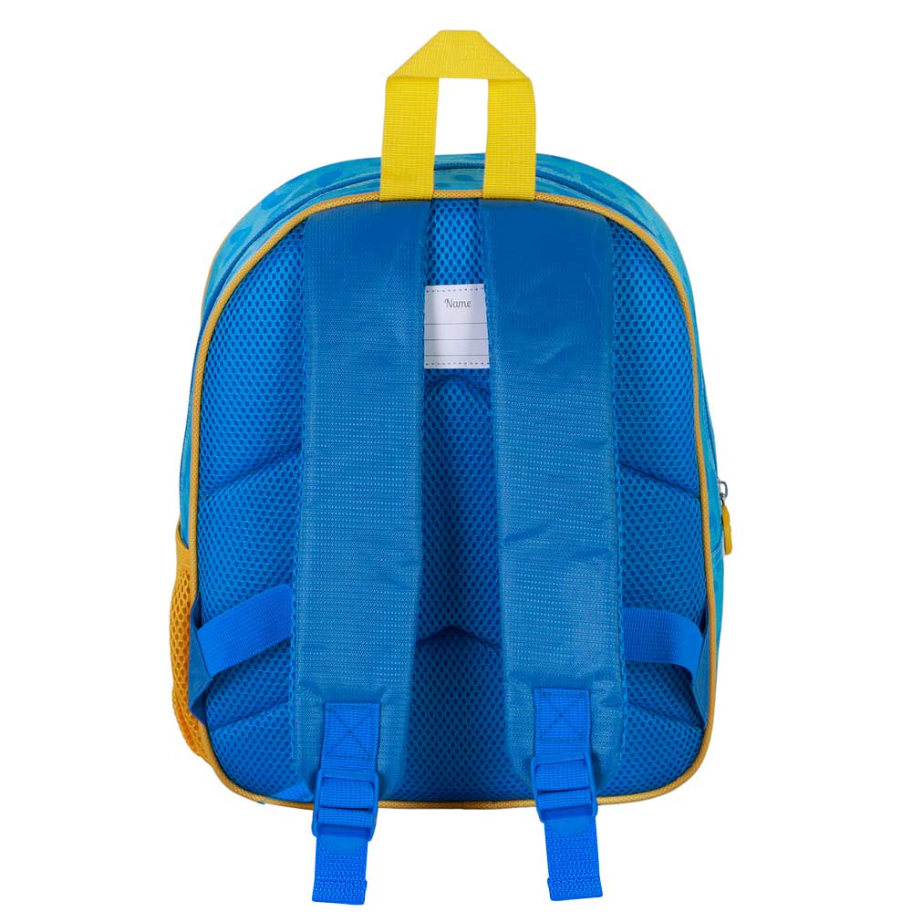 Zainetto prescolare a scomparto unico. Design frontale in rilievo e tasca laterale in rete. Schienale e spallacci imbottiti. Include una targhetta con il nome sul retro.