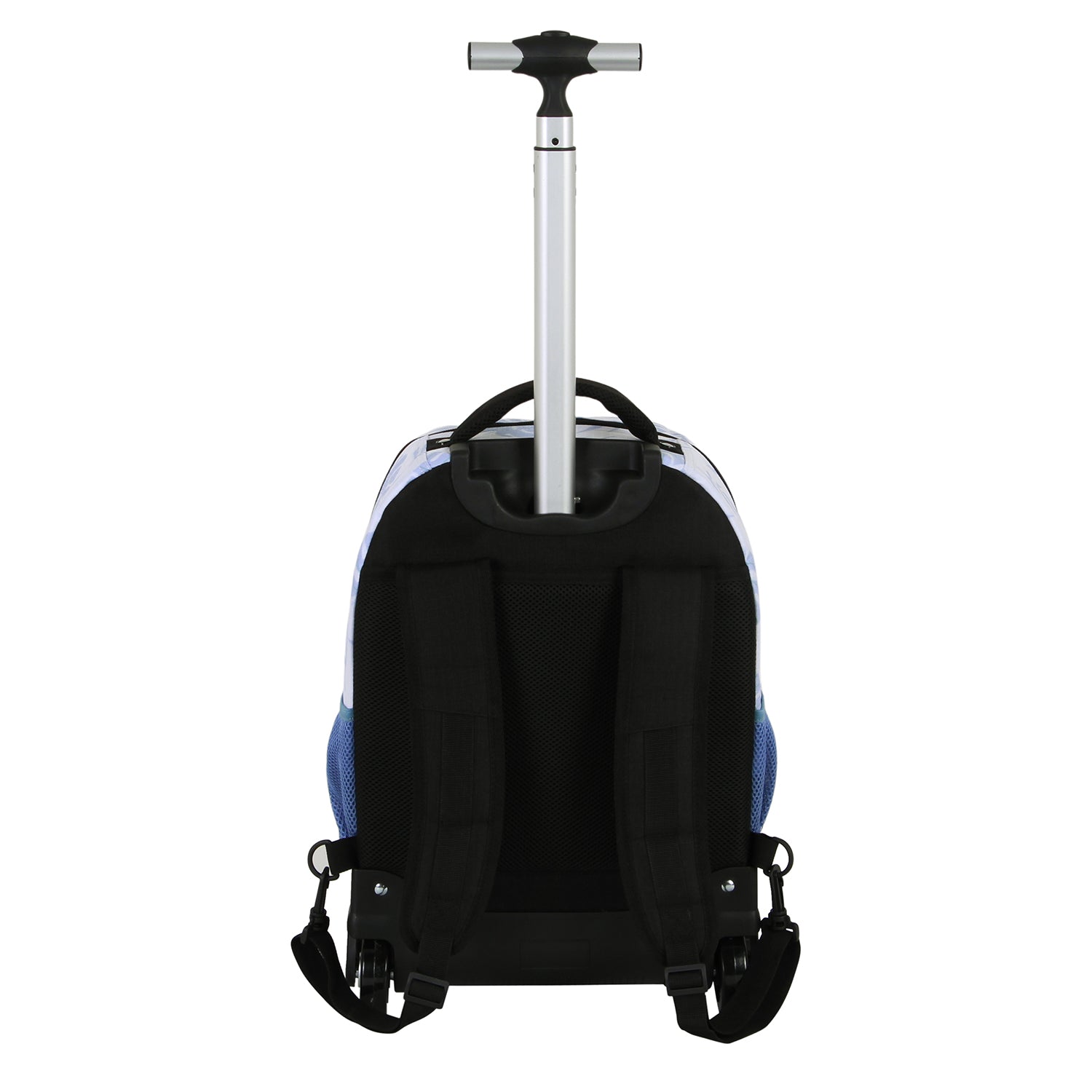 Zaino scuola con 2 ruote integrate. Due scomparti, una tasca frontale e due tasche laterali in rete. Interno foderato con tasca imbottita per dispositivi elettronici. Tracolle da portare come zaino.