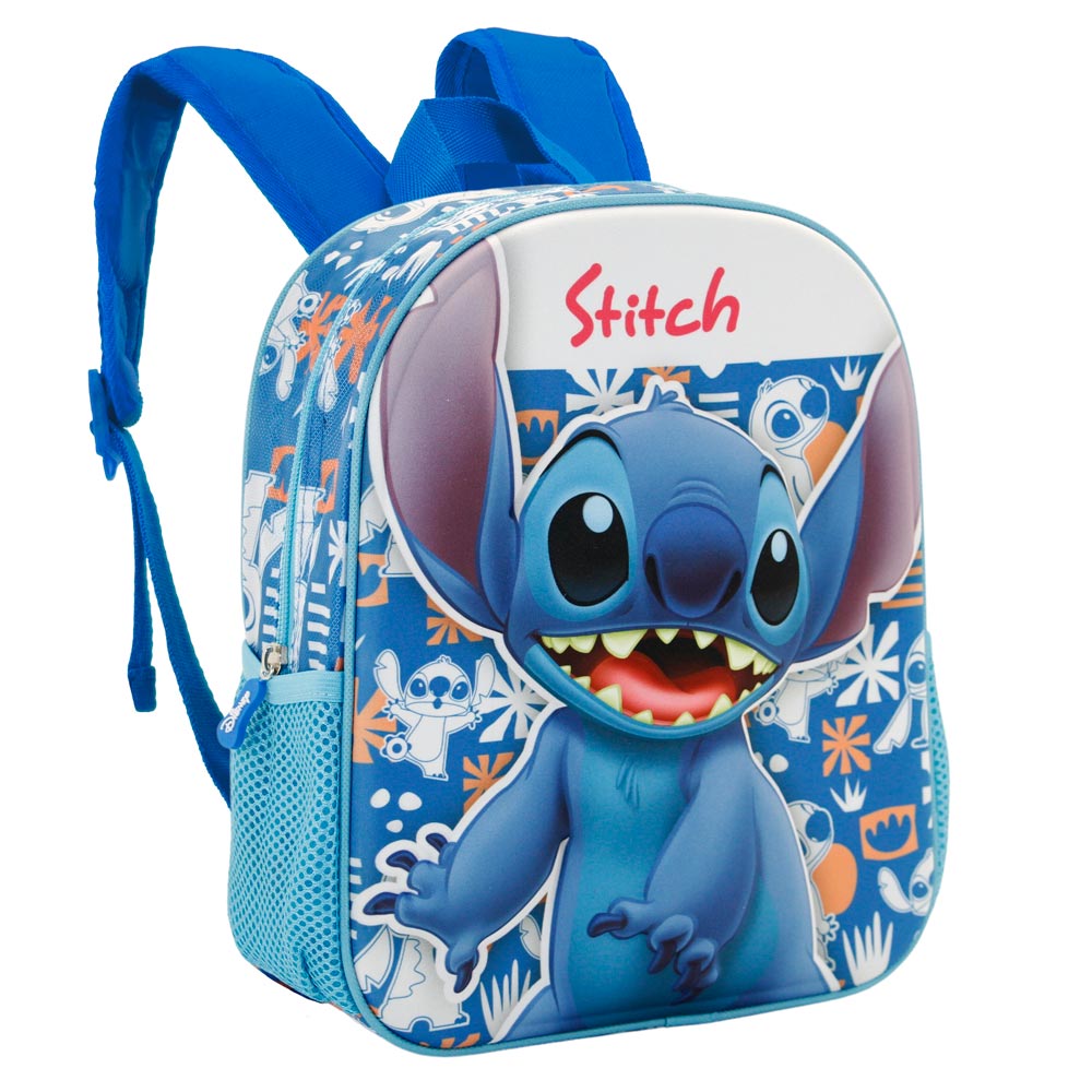 Zainetto prescolare con rilievo frontale 3D. Scomparto principale con cerniera e rivestimento interno. Due tasche laterali in rete.