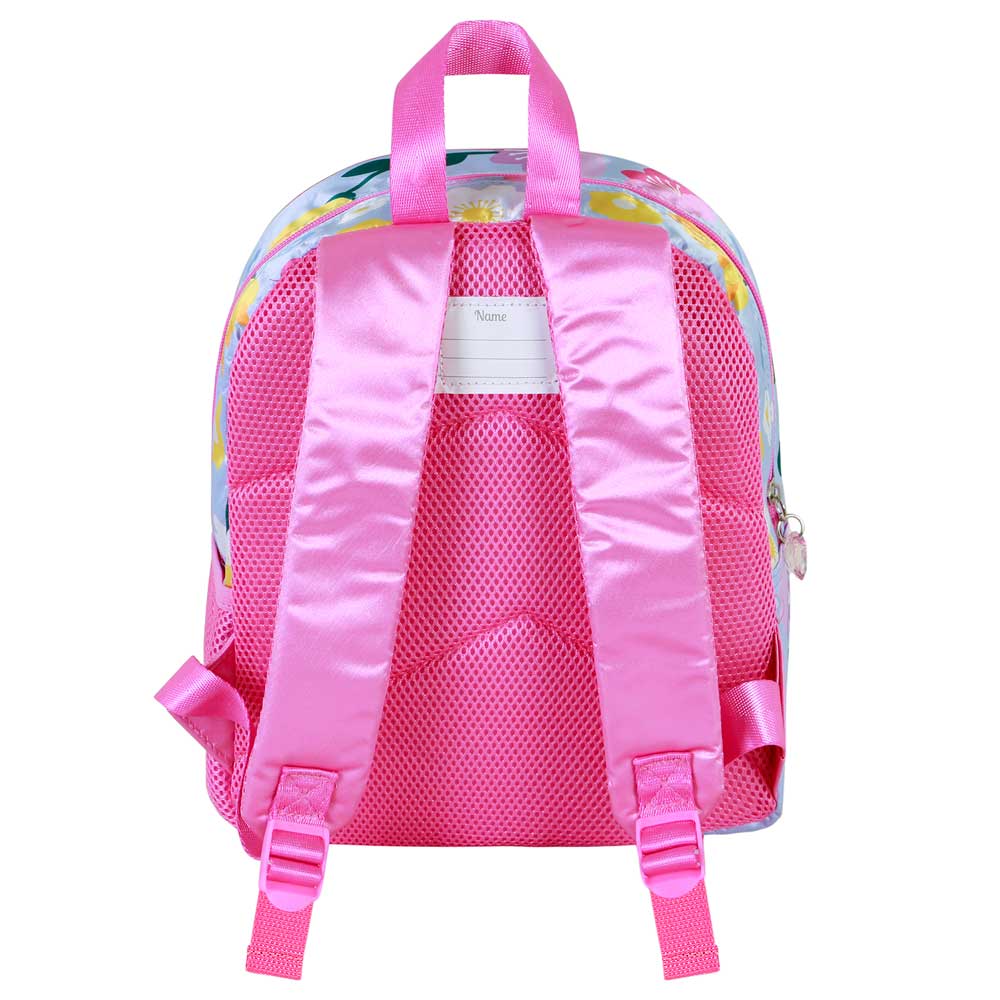 Zainetto prescolare a scomparto unico. Design frontale in rilievo e tasca laterale in rete. Schienale e spallacci imbottiti. Include una targhetta con il nome sul retro.