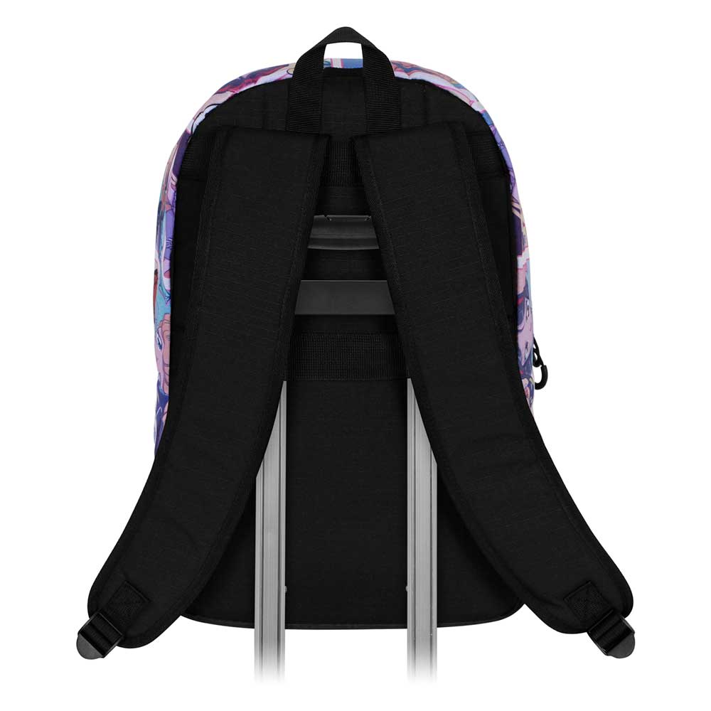Zaino con un unico scomparto e una tasca frontale. Corpo in materiale ad alta resistenza (Ripstop), repellente ai liquidi in quantità moderate. Fodera interna con tasca per dispositivi elettronici. Spallacci imbottiti regolabili e cinghia posterioreadattabile al trolley.