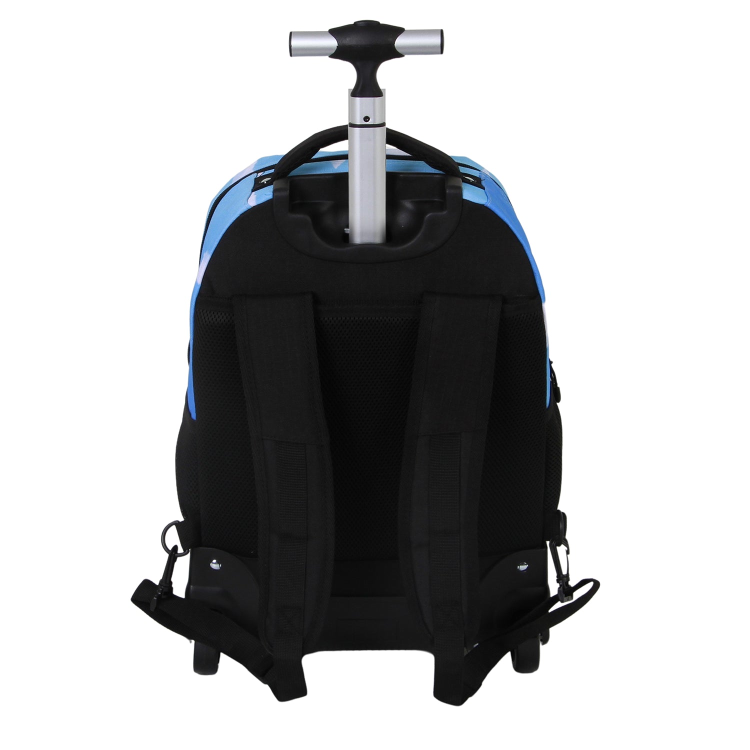 Zaino scuola con 2 ruote integrate. Due scomparti, una tasca frontale e due tasche laterali in rete. Interno foderato con tasca imbottita per dispositivi elettronici. Tracolle da portare come zaino.