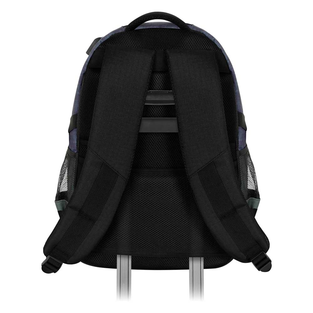 Zaino di grande capacità con tre scomparti principali e due tasche laterali in rete. Fodera interna con una tasca imbottita per i dispositivi elettronici e una piccola tasca con cerniera. Porta USB per la ricarica della powerbank (non inclusa). Corpoin materiale ad alta resistenza (Ripstop), repellente ai liquidi in quantità moderate. Base e cinghie rinforzate, maniglia superiore e schienale imbottiti con canali di ventilazione. Pannello posteriore per il trasporto con trolley.