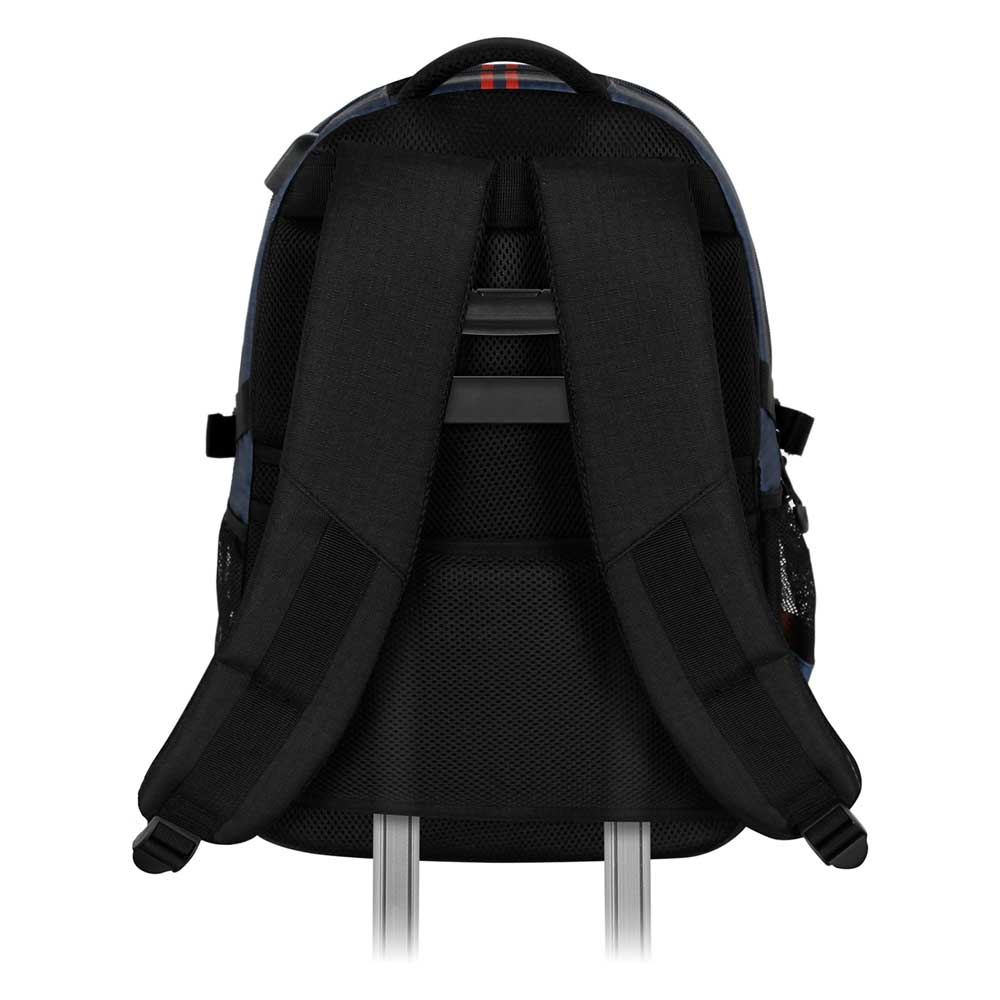Zaino di grande capacità con tre scomparti principali e due tasche laterali in rete. Fodera interna con una tasca imbottita per i dispositivi elettronici e una piccola tasca con cerniera. Porta USB per la ricarica della powerbank (non inclusa). Corpoin materiale ad alta resistenza (Ripstop), repellente ai liquidi in quantità moderate. Base e cinghie rinforzate, maniglia superiore e schienale imbottiti con canali di ventilazione. Pannello posteriore per il trasporto con trolley.