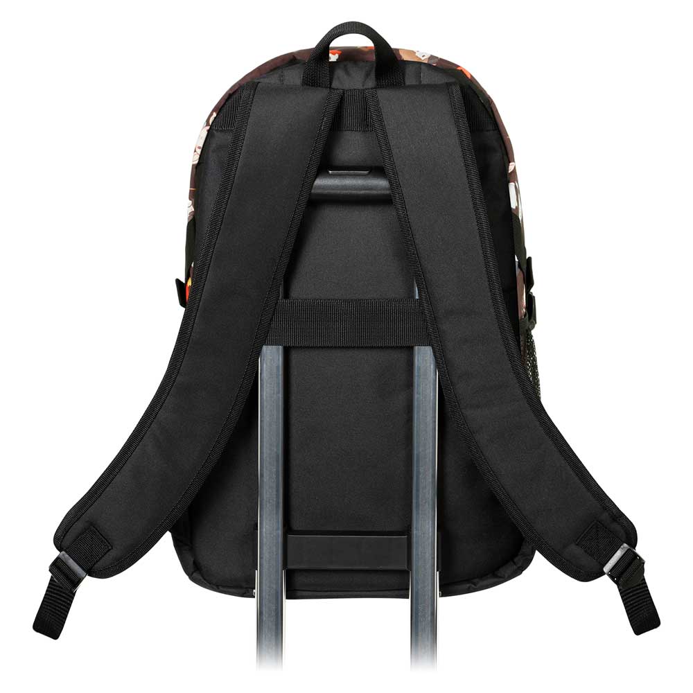 Zaino urbano leggero con un unico scomparto e due tasche frontali. Spallacci imbottiti regolabili, due tasche laterali in rete e tracolla trolley posteriore. Interno foderato con tasca imbottita per dispositivi elettronici.
