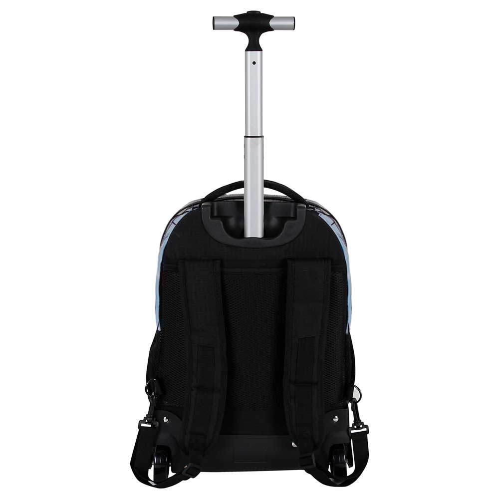 Zaino scuola con 2 ruote integrate. Due scomparti, una tasca frontale e due tasche laterali in rete. Interno foderato con tasca imbottita per dispositivi elettronici. Tracolle da portare come zaino.