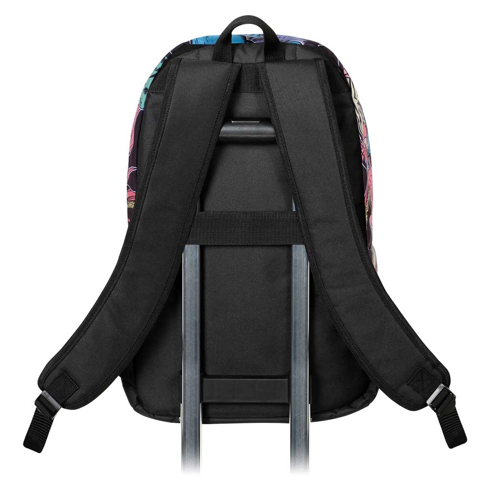 Zaino urbano leggero con un unico scomparto. Fodera interna con tasca per dispositivi elettronici. Tasca frontale, spallacci imbottiti regolabili e tracolla per trolley posteriore.