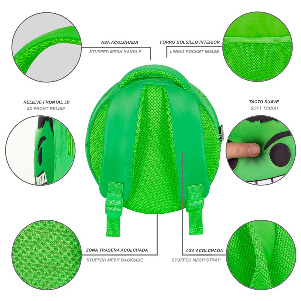 Zainetto rotondo in materiale morbido con stampa in rilievo 3D sul davanti. Uno scomparto principale con chiusura a zip. Fodera interna con tasca a rete. Spallacci regolabili. Schienale, spallacci e manico superiore imbottiti.