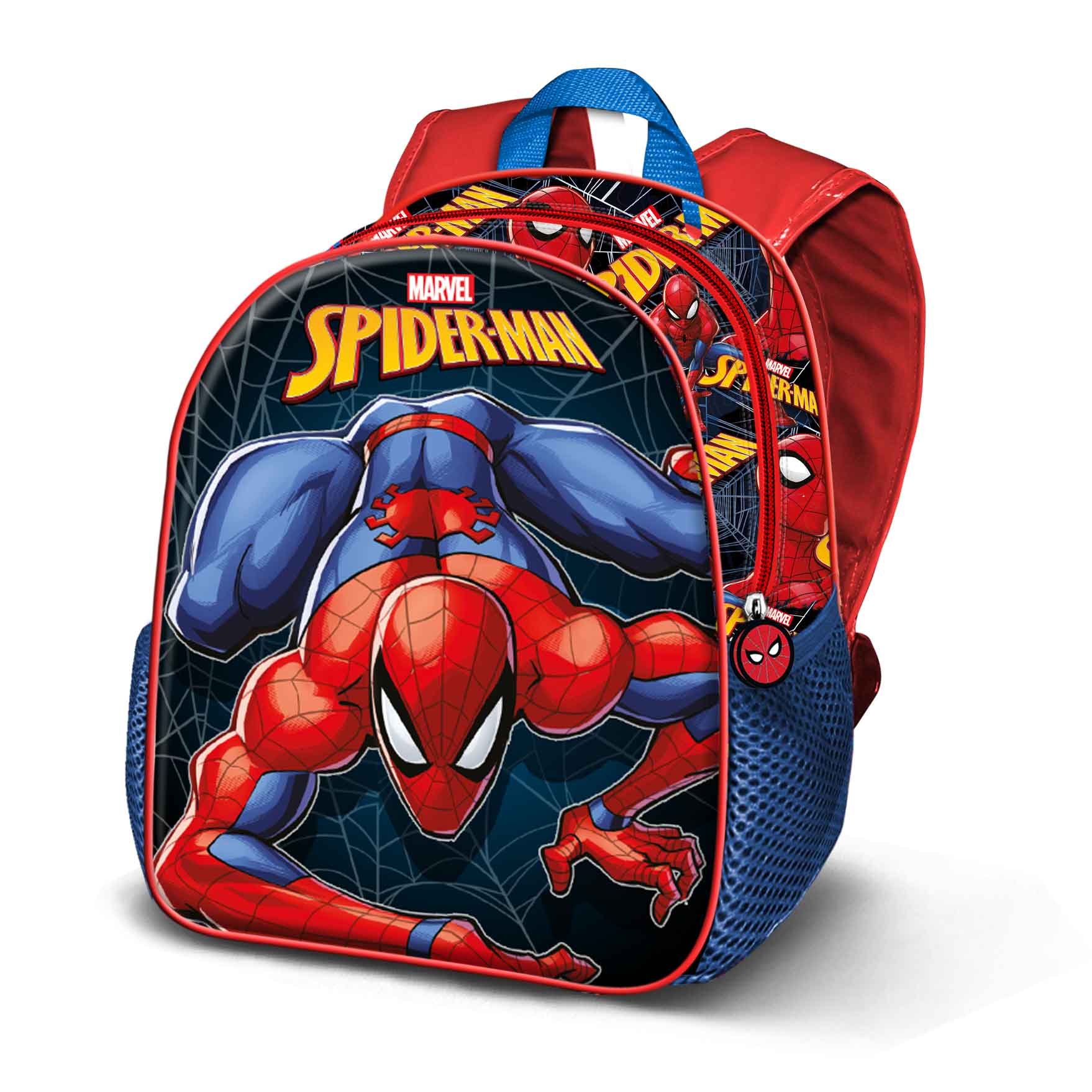 Zainetto prescolare con rilievo frontale 3D. Scomparto principale con cerniera e rivestimento interno. Due tasche laterali in rete.