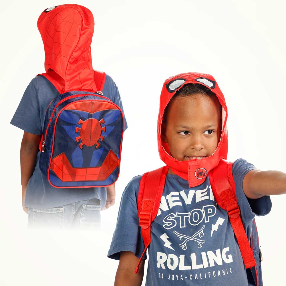 Zainetto per bambini con uno scomparto e cappuccio da costume integrato, non rimovibile. Cappuccio con stampa di personaggi, a seconda del modello, con chiusura a velcro. Tasca con cerniera accanto alla maniglia superiore per riporre il cappuccio quandonon viene utilizzato. Spallacci imbottiti e regolabili.