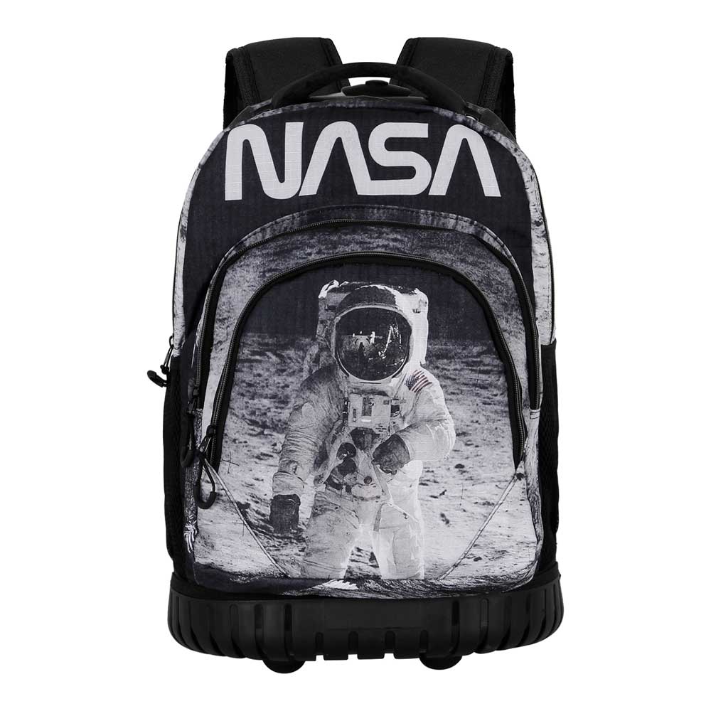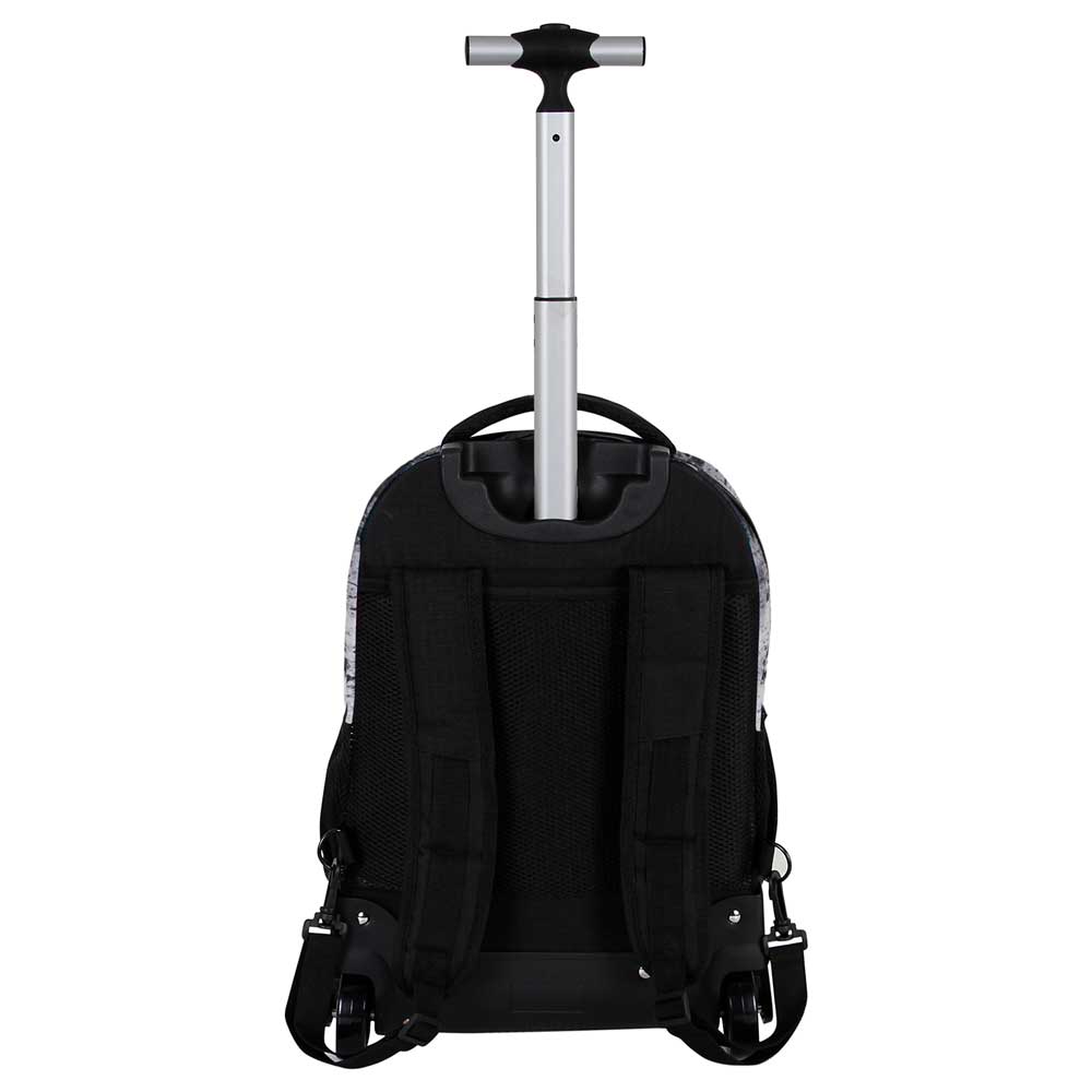 Zaino scuola con 2 ruote integrate. Due scomparti, una tasca frontale e due tasche laterali in rete. Interno foderato con tasca imbottita per dispositivi elettronici. Tracolle da portare come zaino.