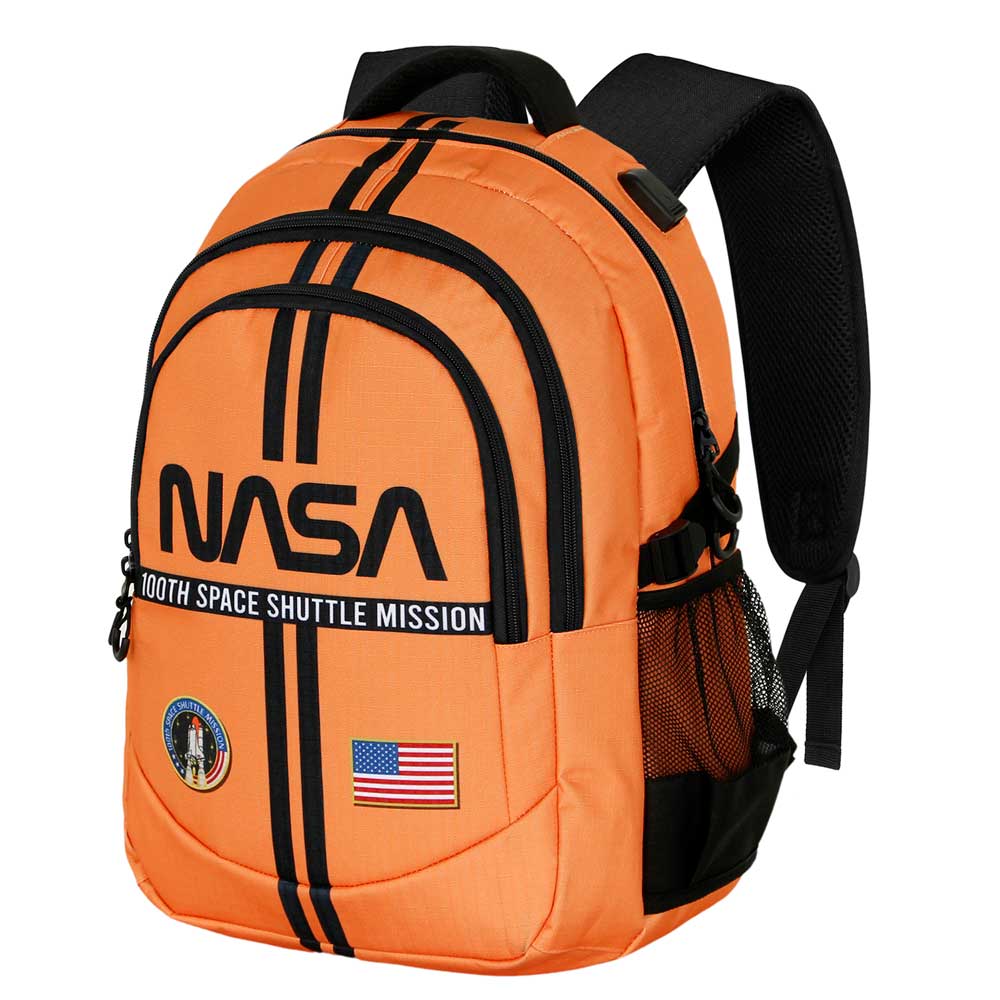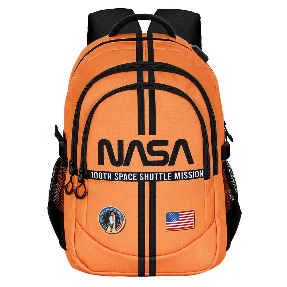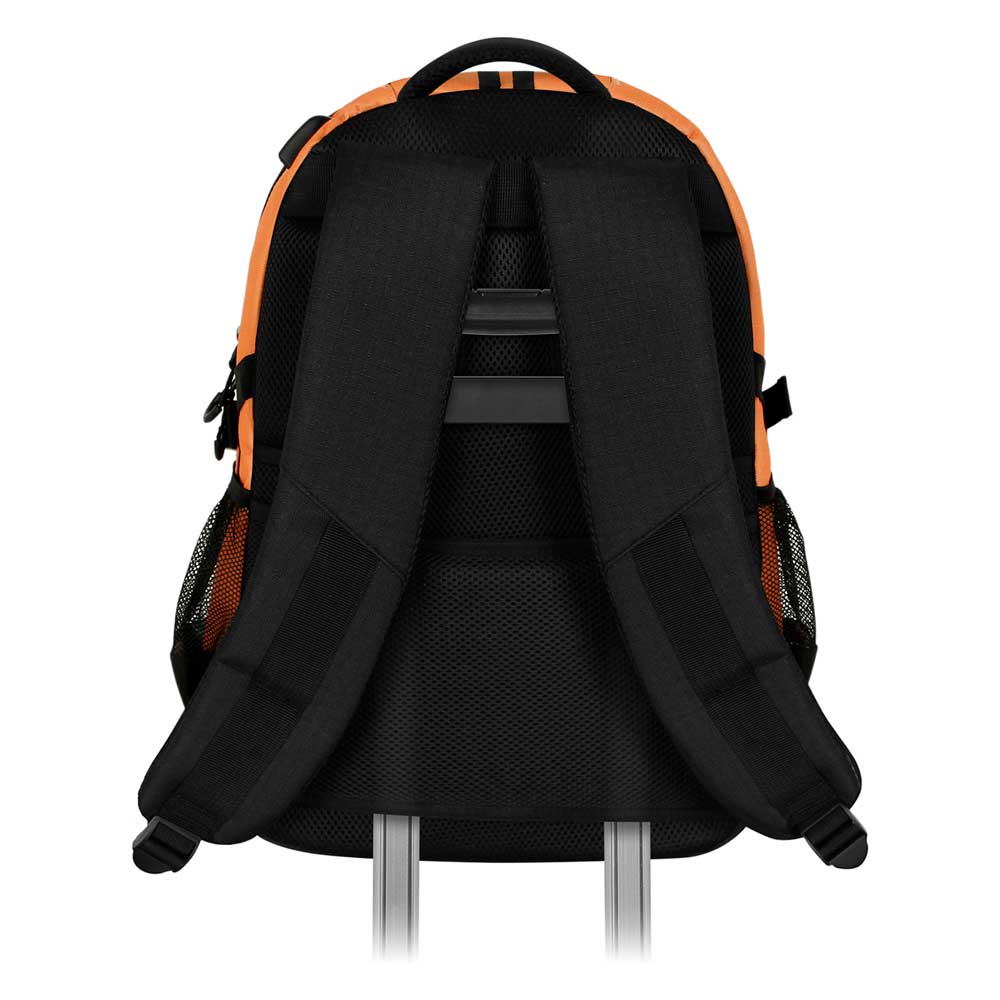 Zaino di grande capacità con tre scomparti principali e due tasche laterali in rete. Fodera interna con una tasca imbottita per i dispositivi elettronici e una piccola tasca con cerniera. Porta USB per la ricarica della powerbank (non inclusa). Corpoin materiale ad alta resistenza (Ripstop), repellente ai liquidi in quantità moderate. Base e cinghie rinforzate, maniglia superiore e schienale imbottiti con canali di ventilazione. Pannello posteriore per il trasporto con trolley.