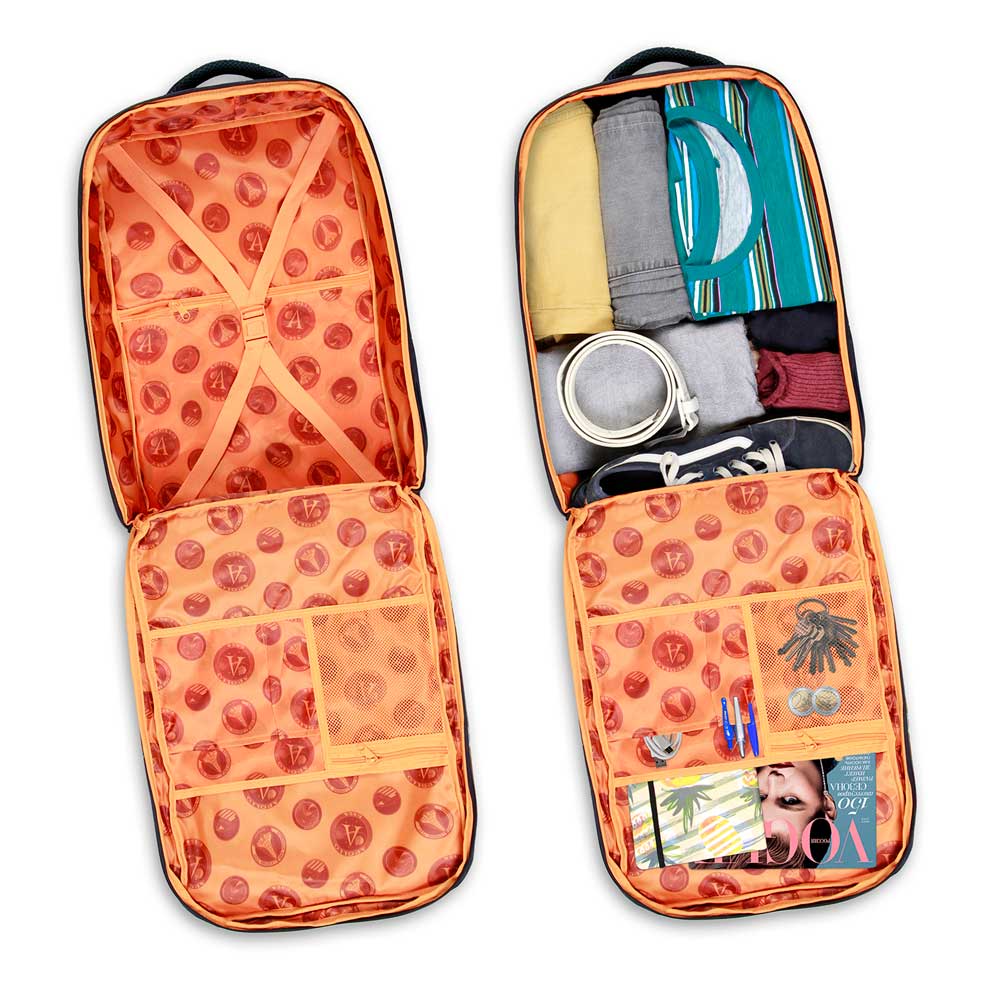 Zaino da cabina che rispetta le dimensioni consentite per il bagaglio a mano della maggior parte delle compagnie aeree, adatto per essere riposto sotto il sedile. Federa esterna è realizzata con materiale leggero ed impermeabile. Presenta tre scomparti con apertura a 180 gradi con fodera interna stampata. Scomparto principale spazioso con tasche interne con zip, insieme a una cinghia di compressione per tenere al sicuro i tuoi effetti personali. Scomparto per laptop é capace di ospitare la maggior parte dei dispositivi fino a 15 pollici, con una ulteriore tasca imbottita per un tablet o accessori. Scomparto anteriore é impermeabile per separare gli articoli bagnati dal resto dei tuoi effetti. Tasca frontale ed una laterale per riponere la bottiglia. Cinghia posteriore consente di fissare il bagaglio in modo sicuro alla valigia. Include una maniglia superiore imbottita, spallacci rinforzati con fettuccia, cinghia pettorale e quattro cinghie laterali per regolare il volume.