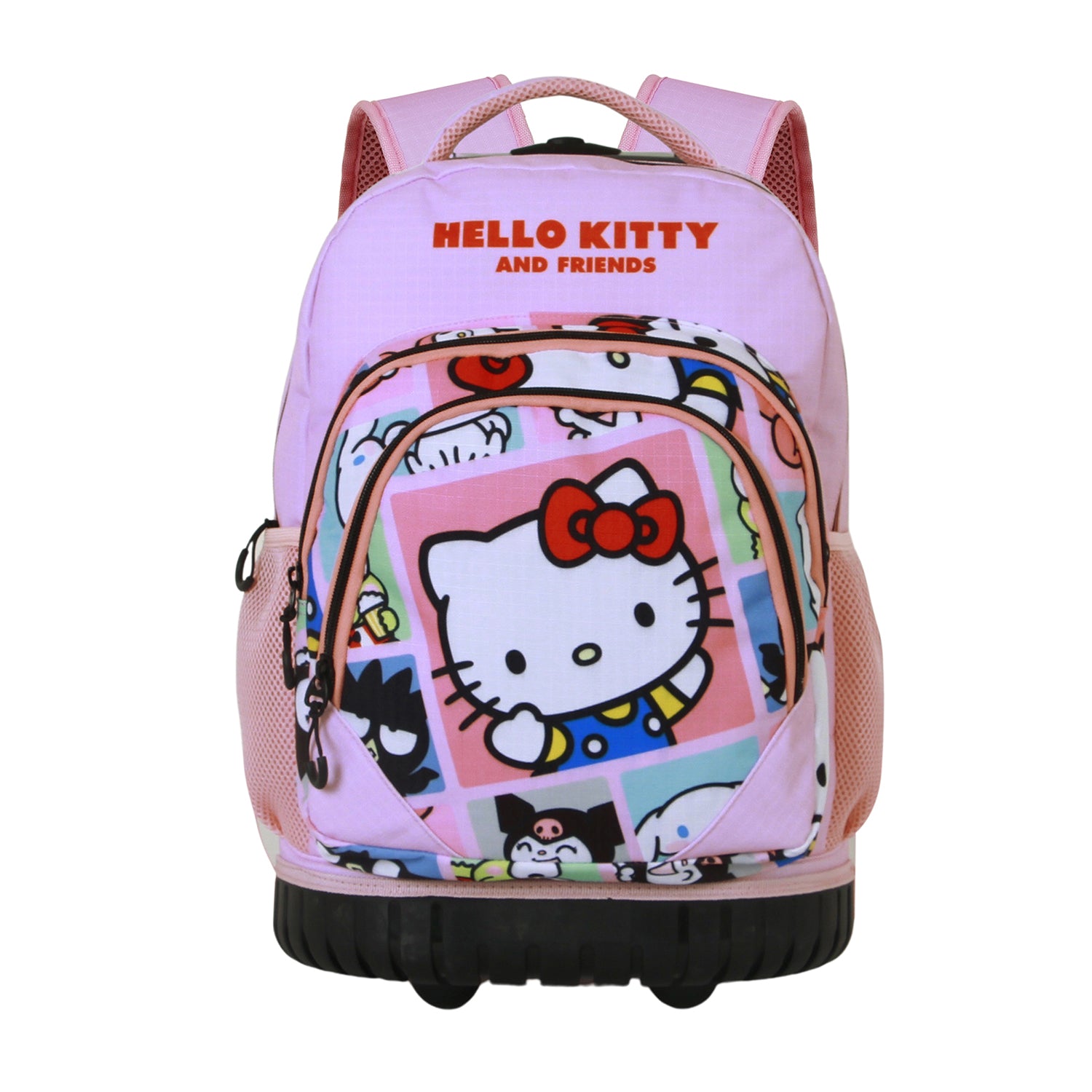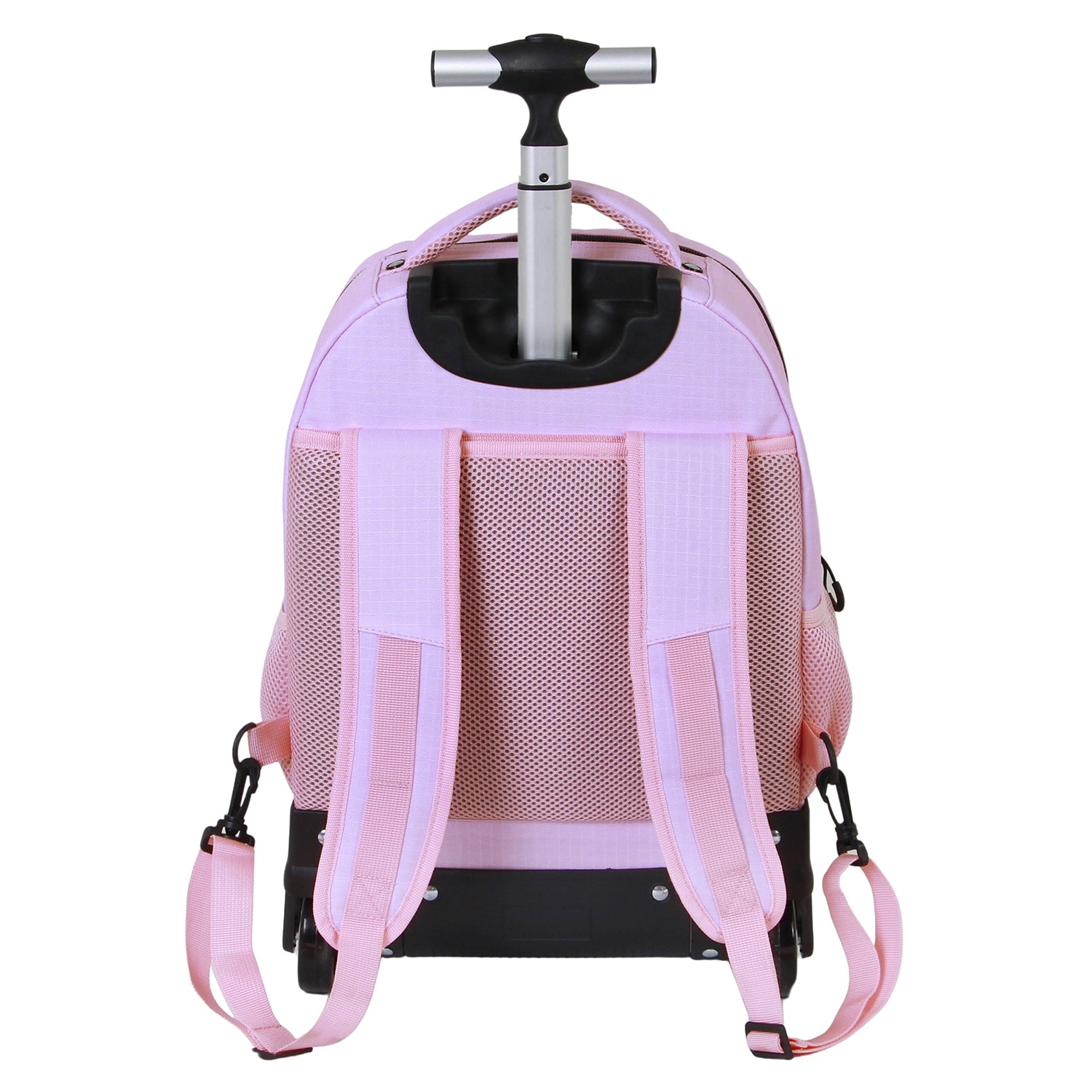 Zaino scuola con 2 ruote integrate. Due scomparti, una tasca frontale e due tasche laterali in rete. Interno foderato con tasca imbottita per dispositivi elettronici. Tracolle da portare come zaino.