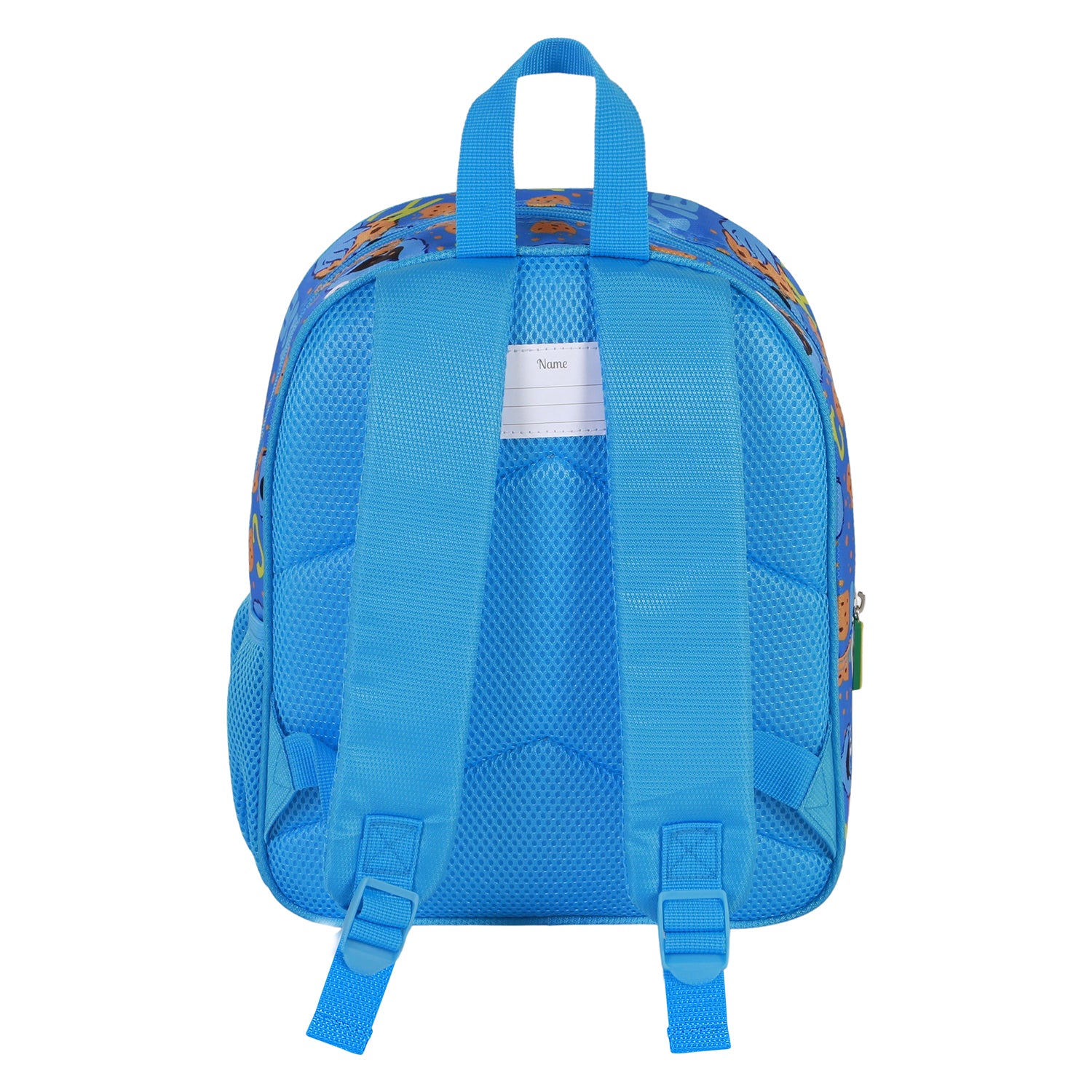 Zainetto prescolare a scomparto unico. Design frontale in rilievo e tasca laterale in rete. Schienale e spallacci imbottiti. Include una targhetta con il nome sul retro.