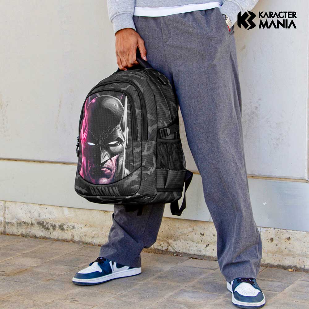 Mochila de gran capacidad con tres compartimentos principales y dos bolsillos laterales de malla. Forro interior con un bolsillo acolchado para dispositivos electrónicos y un pequeño bolsillo con cremallera. Puerto USB para carga con powerbank (no incluido). Cuerpo en material de alta resistencia (Ripstop), repelente a los líquidos en cantidades moderadas. Base y correas reforzadas, acolchado en asa superior y espalda con canales de ventilación. Panel trasero para transporte en carrito.