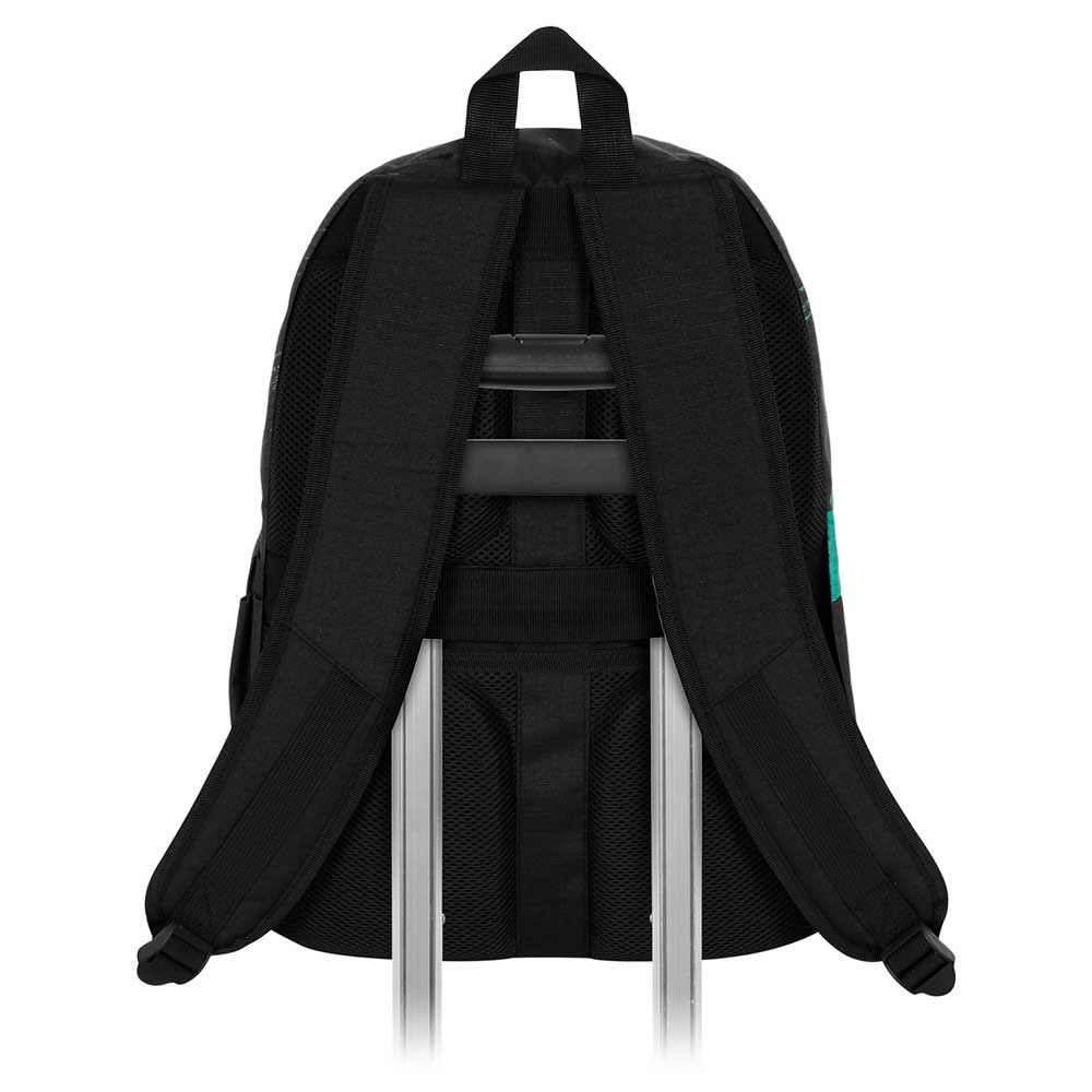 Mochila con un único compartimento, un bolsillo frontal y un bolsillo lateral de malla. Cuerpo en material de alta resistencia (Ripstop), repelente a los líquidos en cantidades moderadas. Forro interior estampado con bolsillo para dispositivos electrónicos acolchado en terciopelo. Correas al hombro reforzadas y ajustables. Espalda acolchada con canales de ventilación, cinta para el trolley y bolsillo de seguridad oculto.