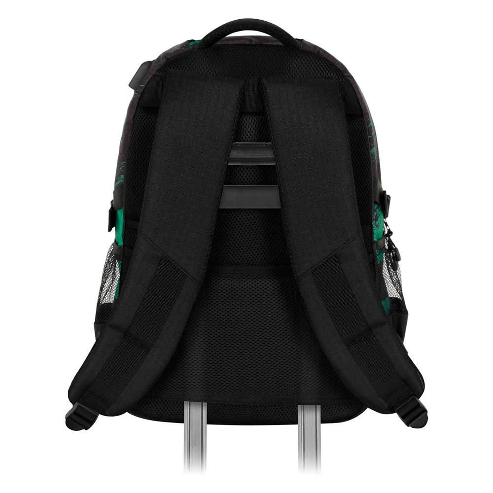 Mochila de gran capacidad con tres compartimentos principales y dos bolsillos laterales de malla. Forro interior con un bolsillo acolchado para dispositivos electrónicos y un pequeño bolsillo con cremallera. Puerto USB para carga con powerbank (no incluido). Cuerpo en material de alta resistencia (Ripstop), repelente a los líquidos en cantidades moderadas. Base y correas reforzadas, acolchado en asa superior y espalda con canales de ventilación. Panel trasero para transporte en carrito.