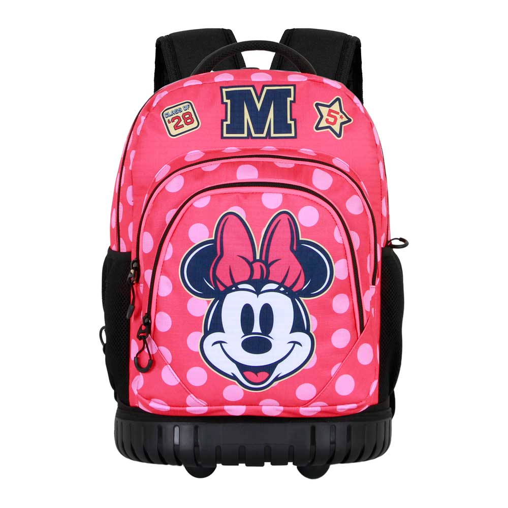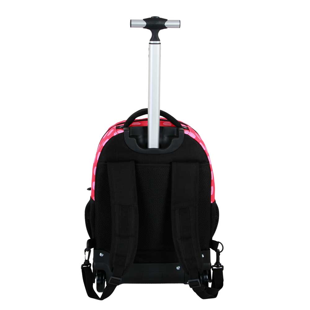 Mochila escolar con 2 ruedas integradas. Dos compartimentos, un bolsillo frontal y dos bolsillos laterales de red. Interior con forro y bolsillo acolchado para dispositivos electrónicos. Correas al hombro para llevar como mochila.