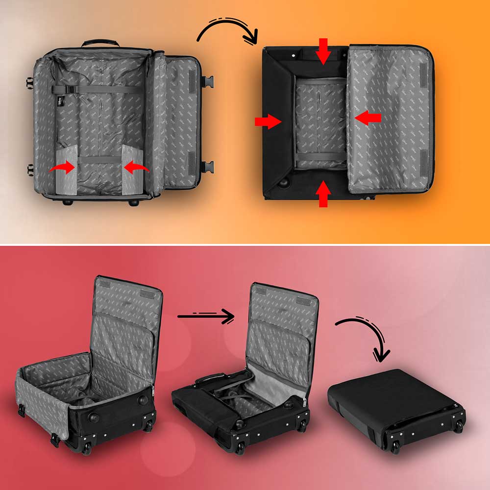 Maleta blanda de 2 ruedas de tamaño de equipaje de cabina. Formato plegable que permite reducir su profundidad a 10cm para guardarla cómodamente. Cierre aprobado por Travel Sentry® (para inspecciones de seguridad sin daños).