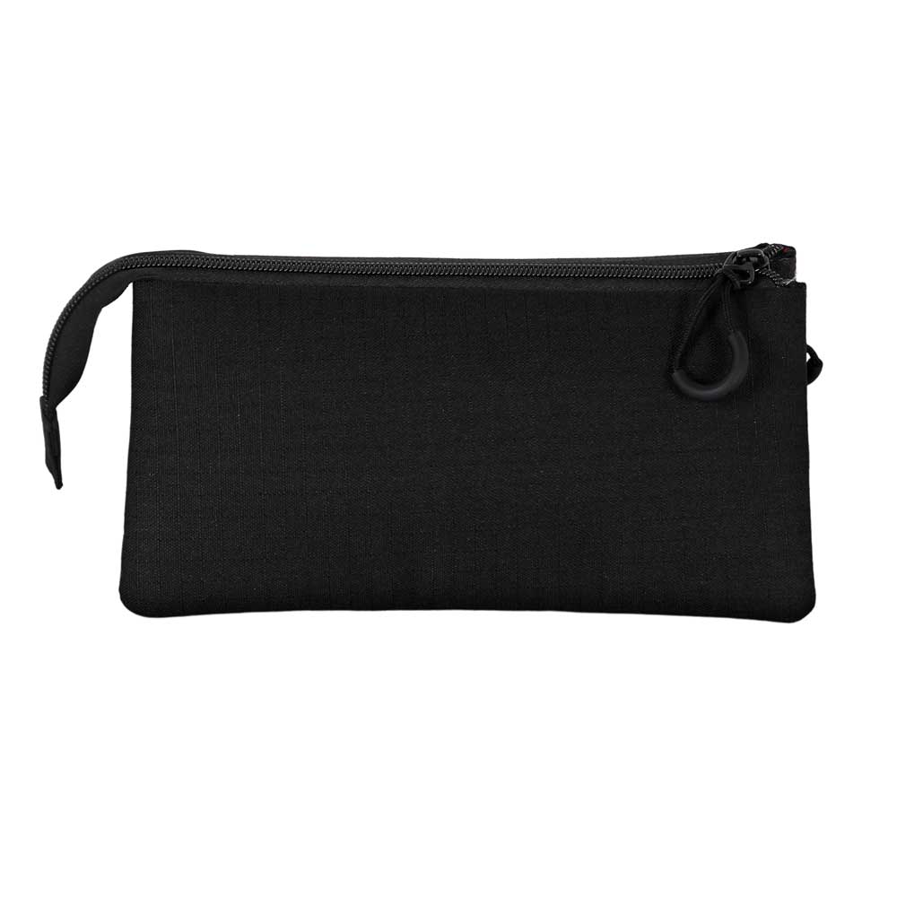 Estuche portatodo rectangular con tres compartimentos y detalles en acabado plateado. Los dos bolsillos exteriores se abren con la cremallera principal y el tercero con una propia.