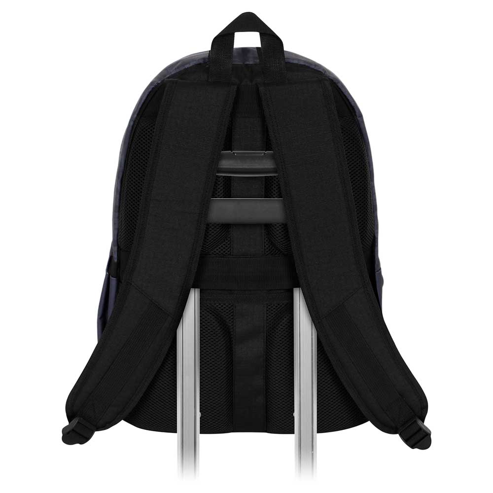 Mochila con un único compartimento, un bolsillo frontal y un bolsillo lateral de malla. Cuerpo en material de alta resistencia (Ripstop), repelente a los líquidos en cantidades moderadas. Forro interior estampado con bolsillo para dispositivos electrónicos acolchado en terciopelo. Correas al hombro reforzadas y ajustables. Espalda acolchada con canales de ventilación, cinta para el trolley y bolsillo de seguridad oculto.